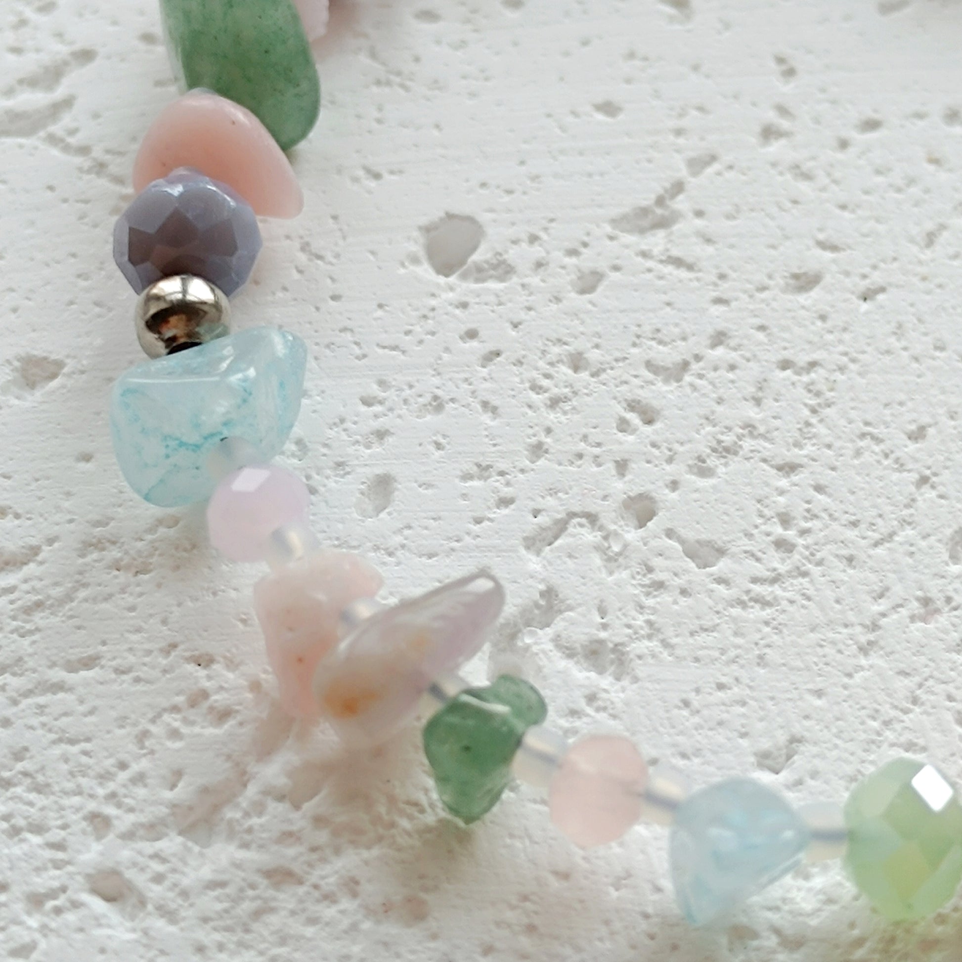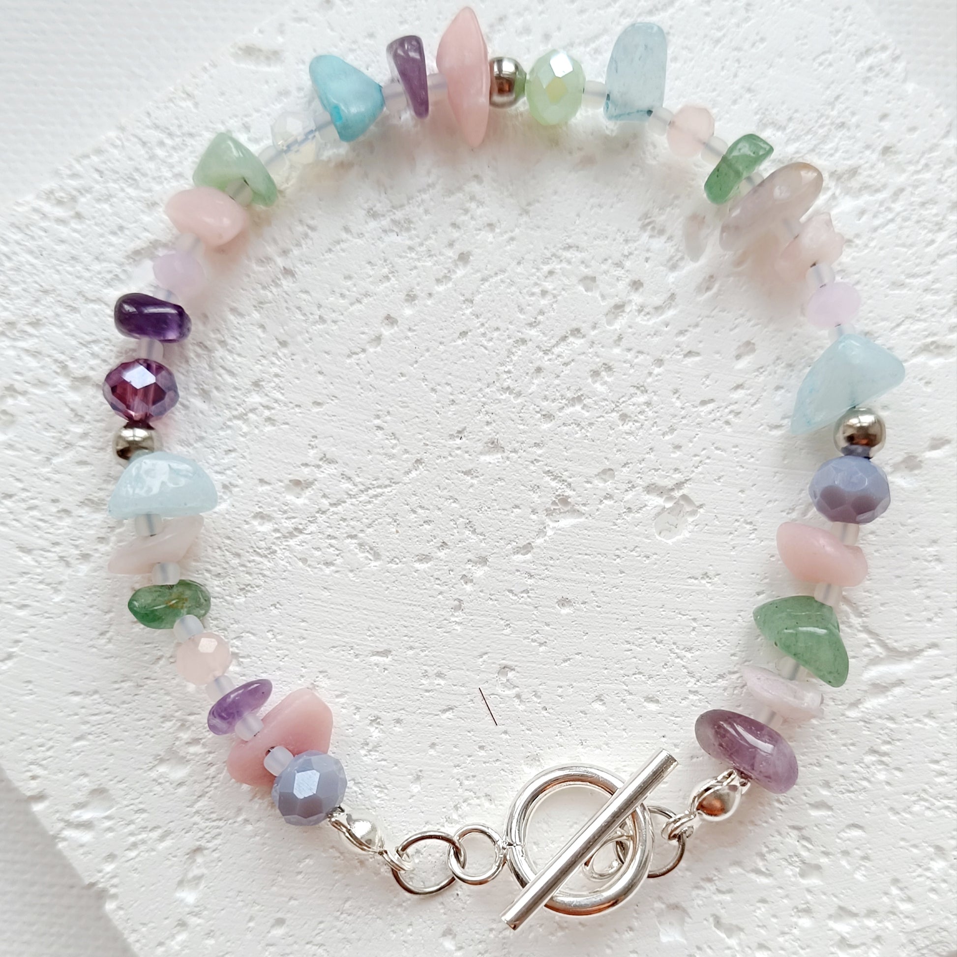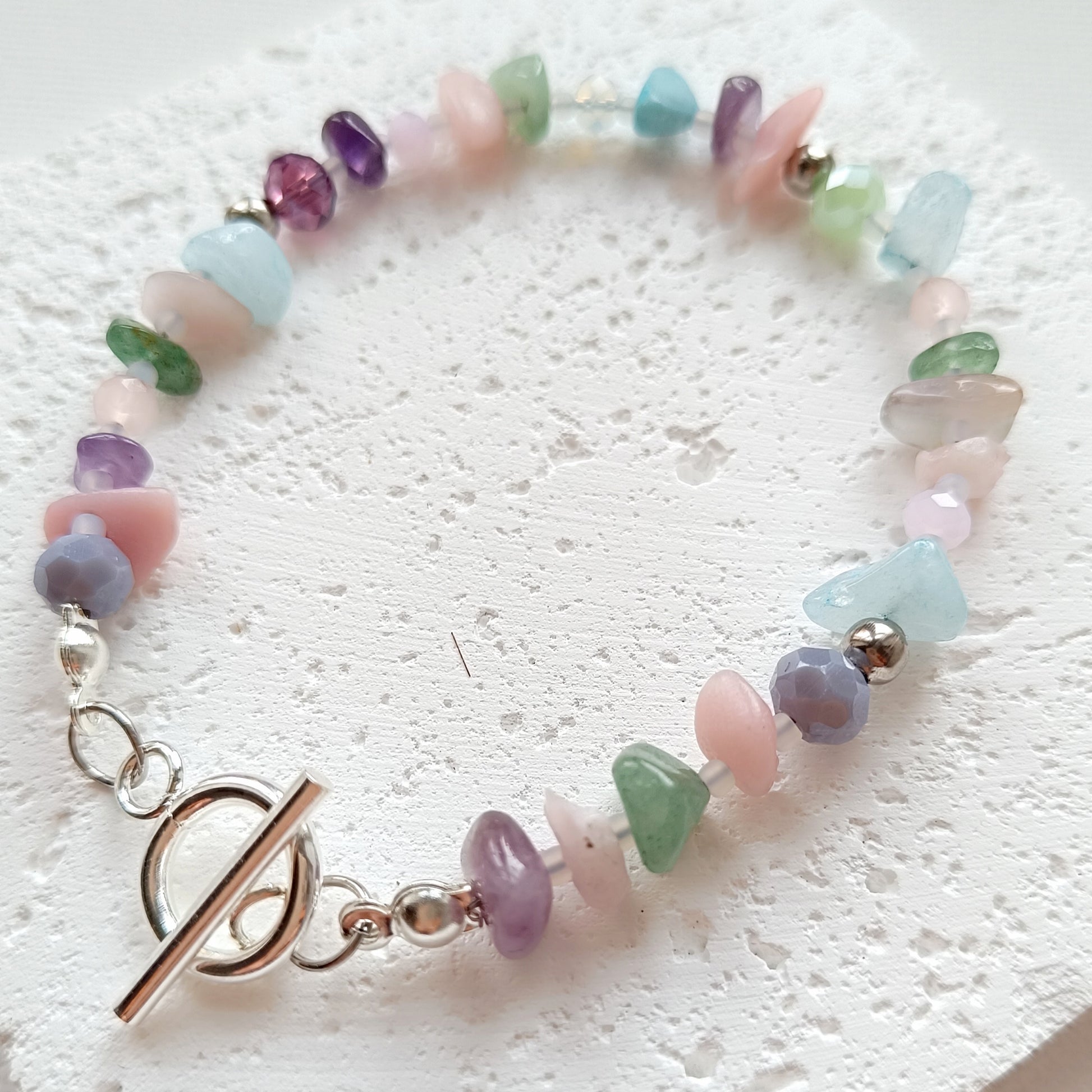 Trendiges Armband aus Natursteinsplittern (gefärbte Jade), facettierten Glasperlen sowie Edelstahl und TOHO Glasperlen in hellblau, rosa, grün und lila. Einfach mit T- Verschluss an- und ausziehen.