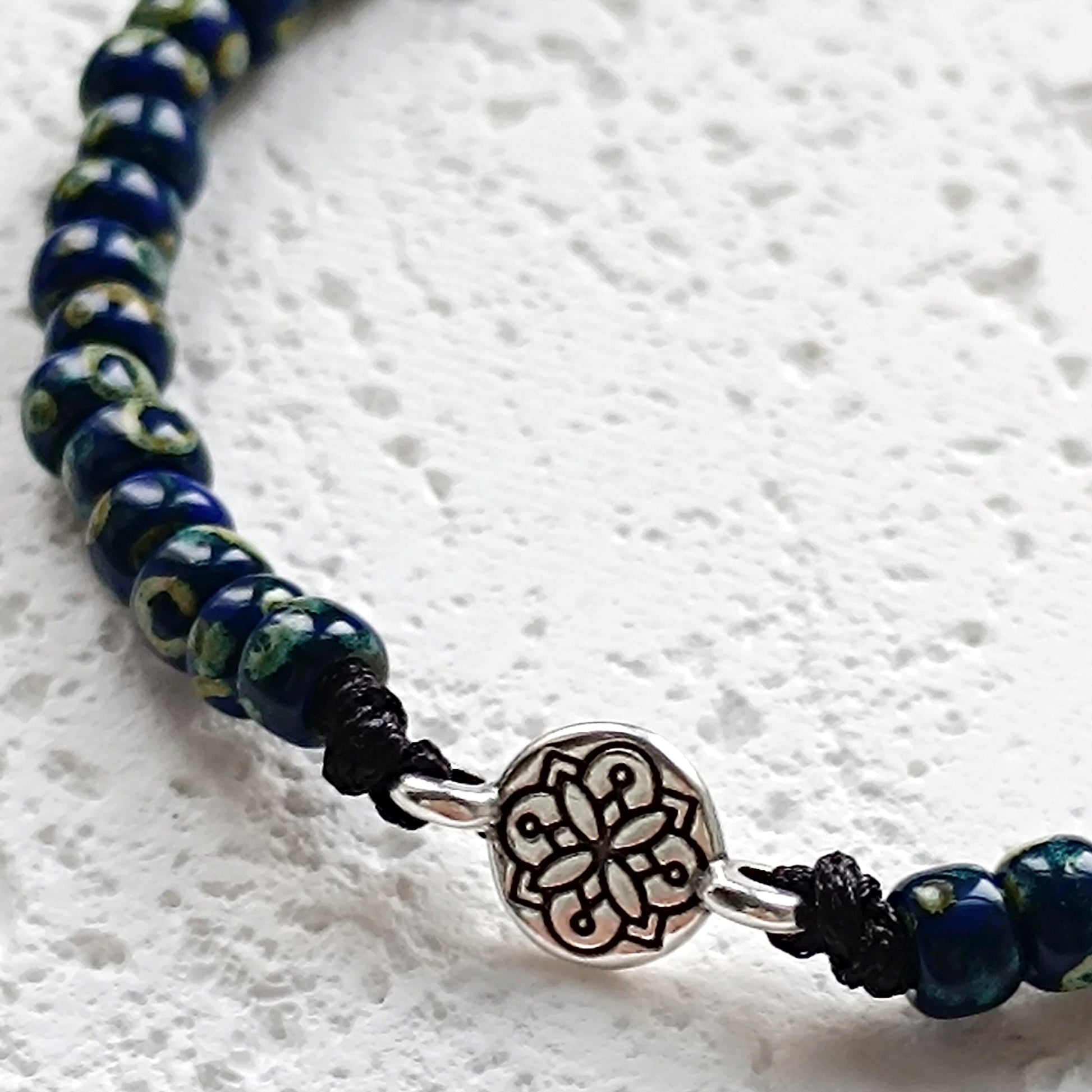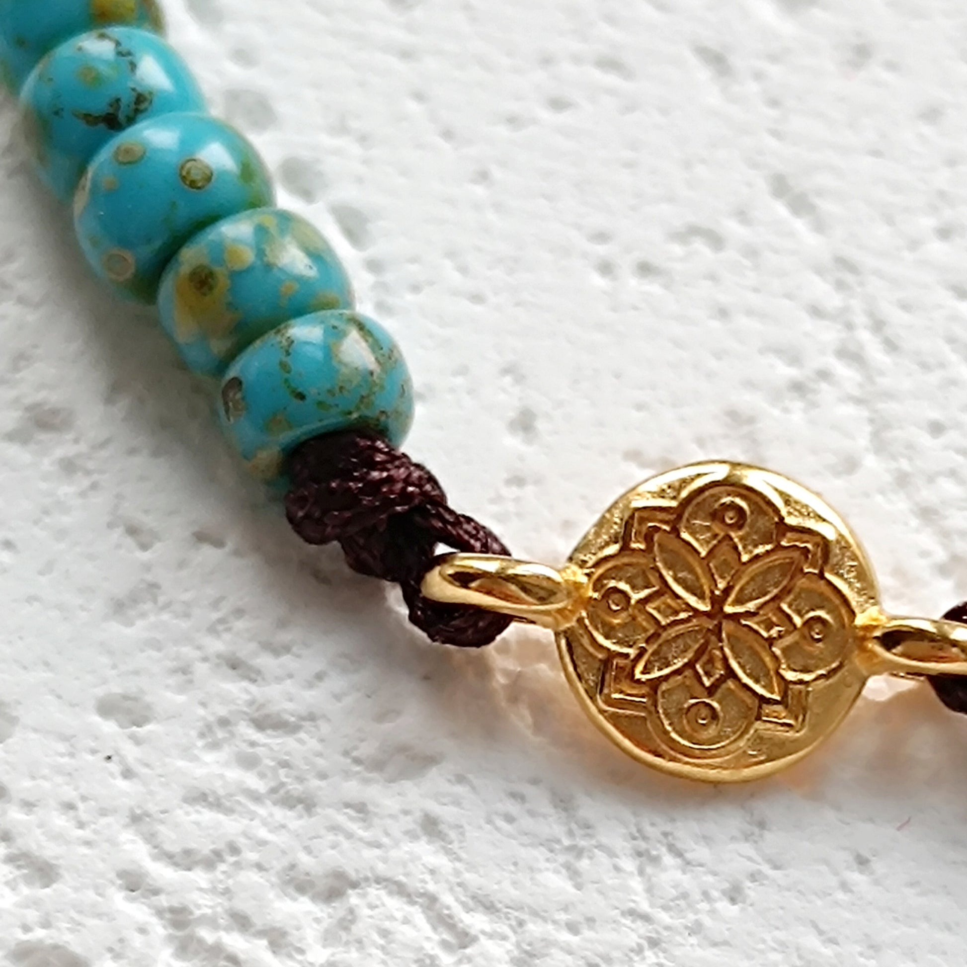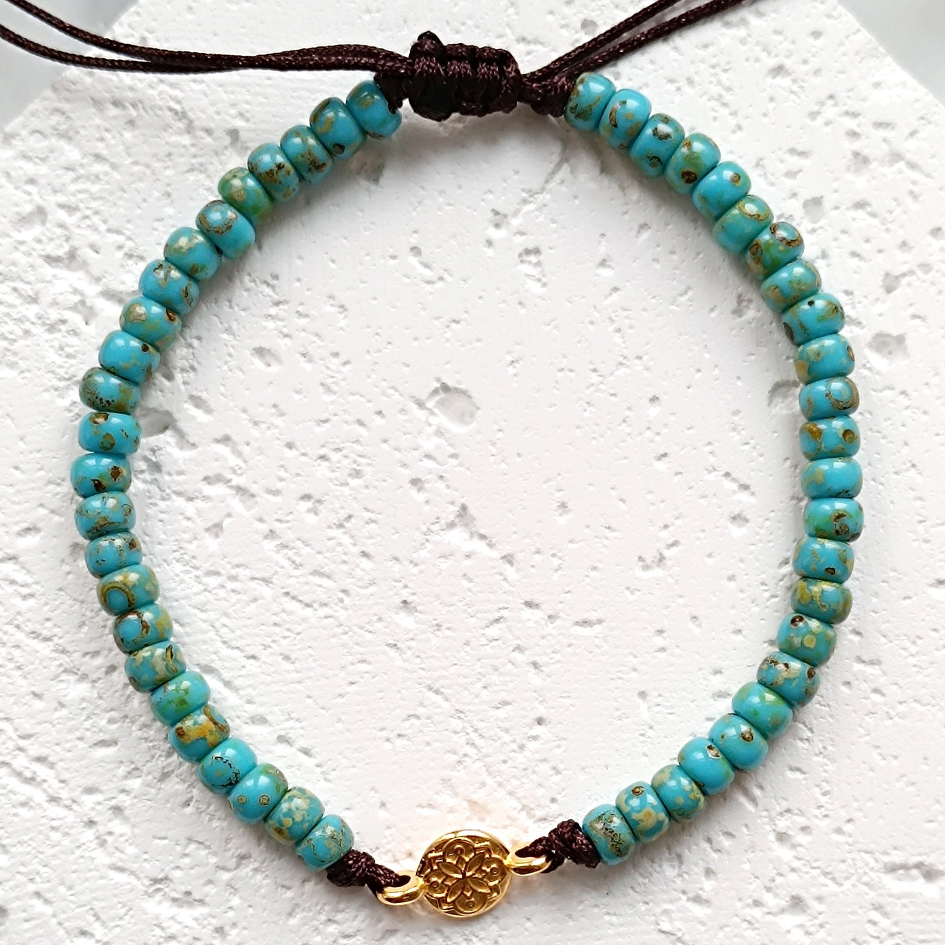 Durch die Zwischenteile im Boho-Stil mit Blumenmuster erhalten die Armbänder einen coolen Vintage-Look. Mit Makrameeverschluss individuell verstellbar.