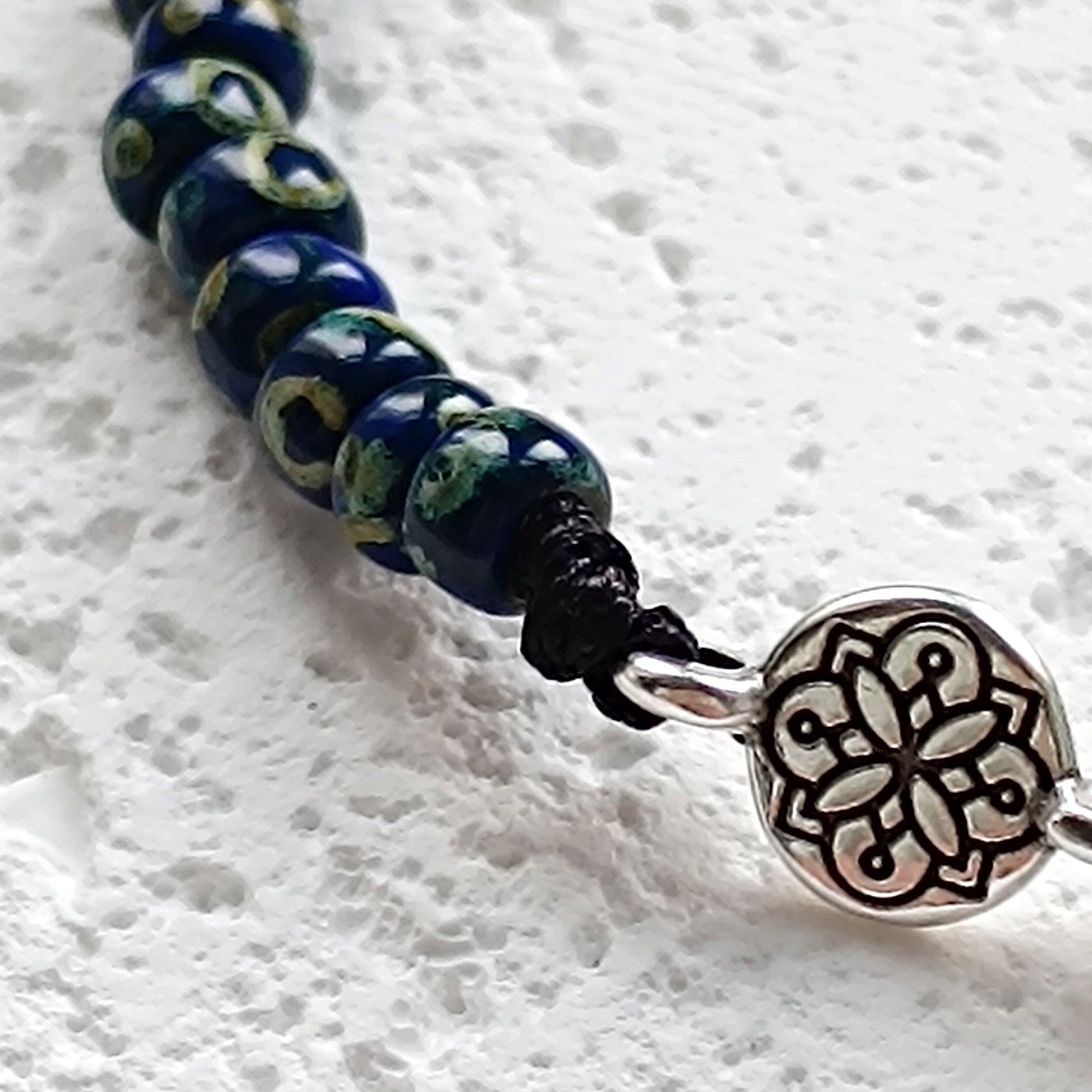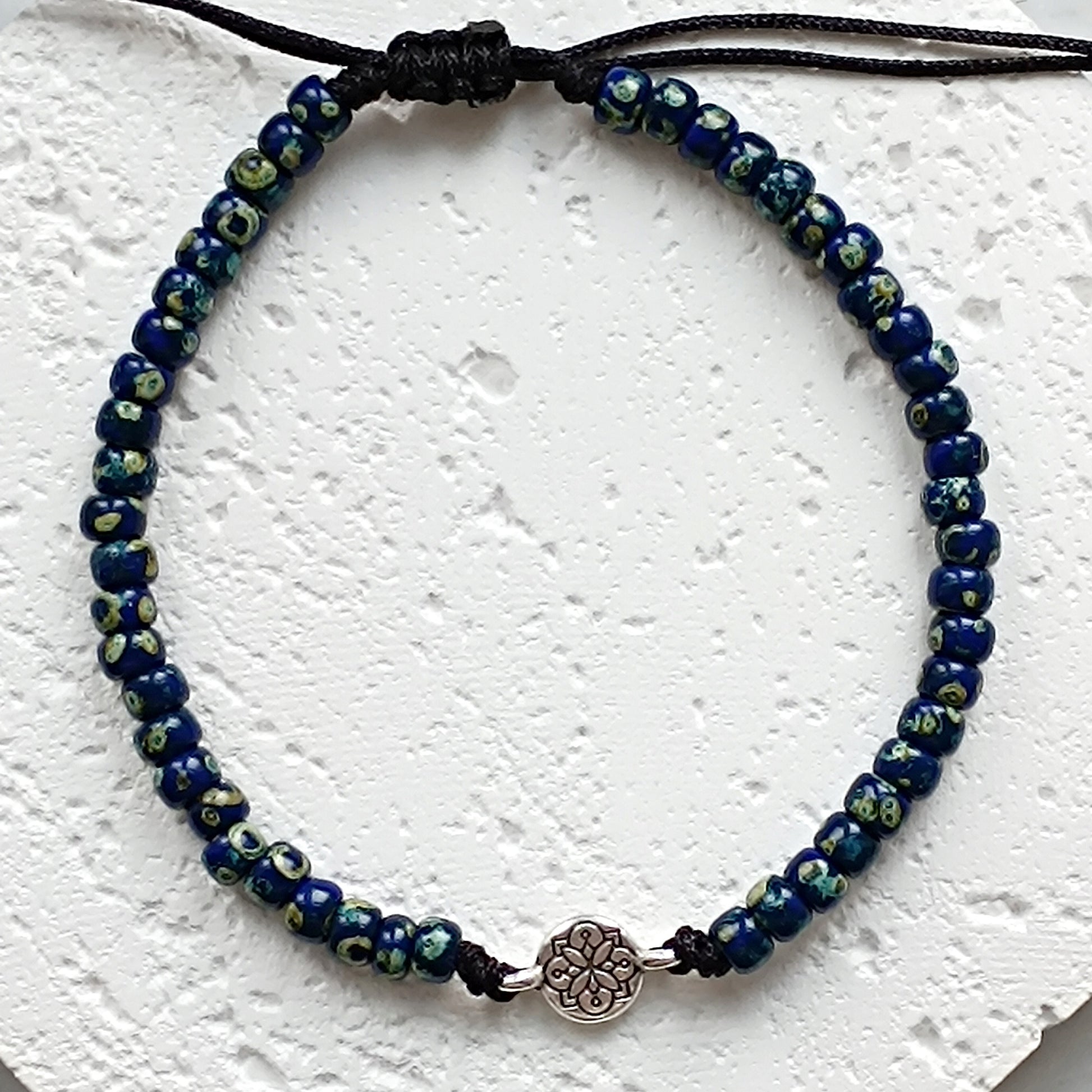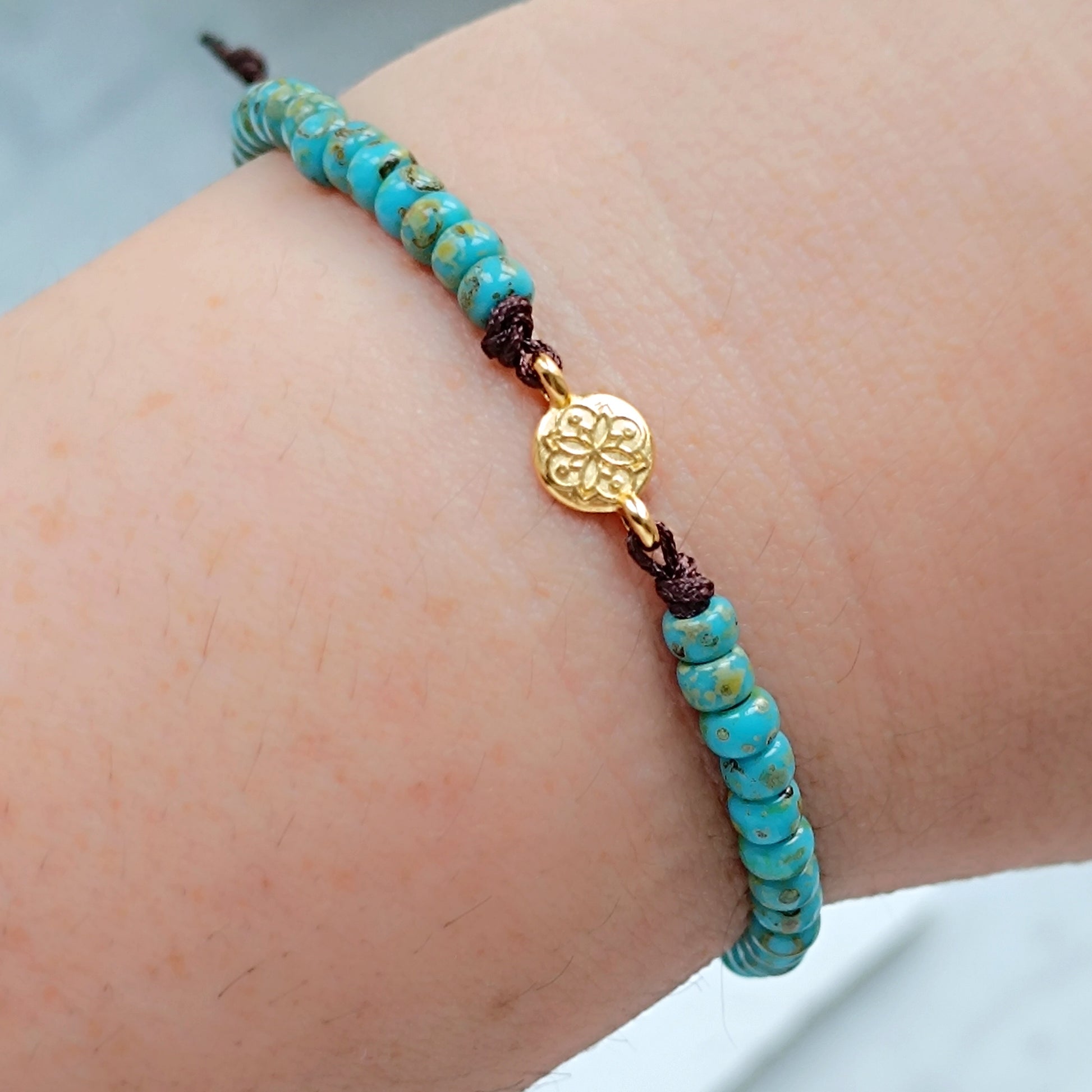 Durch die Zwischenteile im Boho-Stil mit Blumenmuster erhalten die Armbänder einen coolen Vintage-Look. Mit Makrameeverschluss individuell verstellbar.