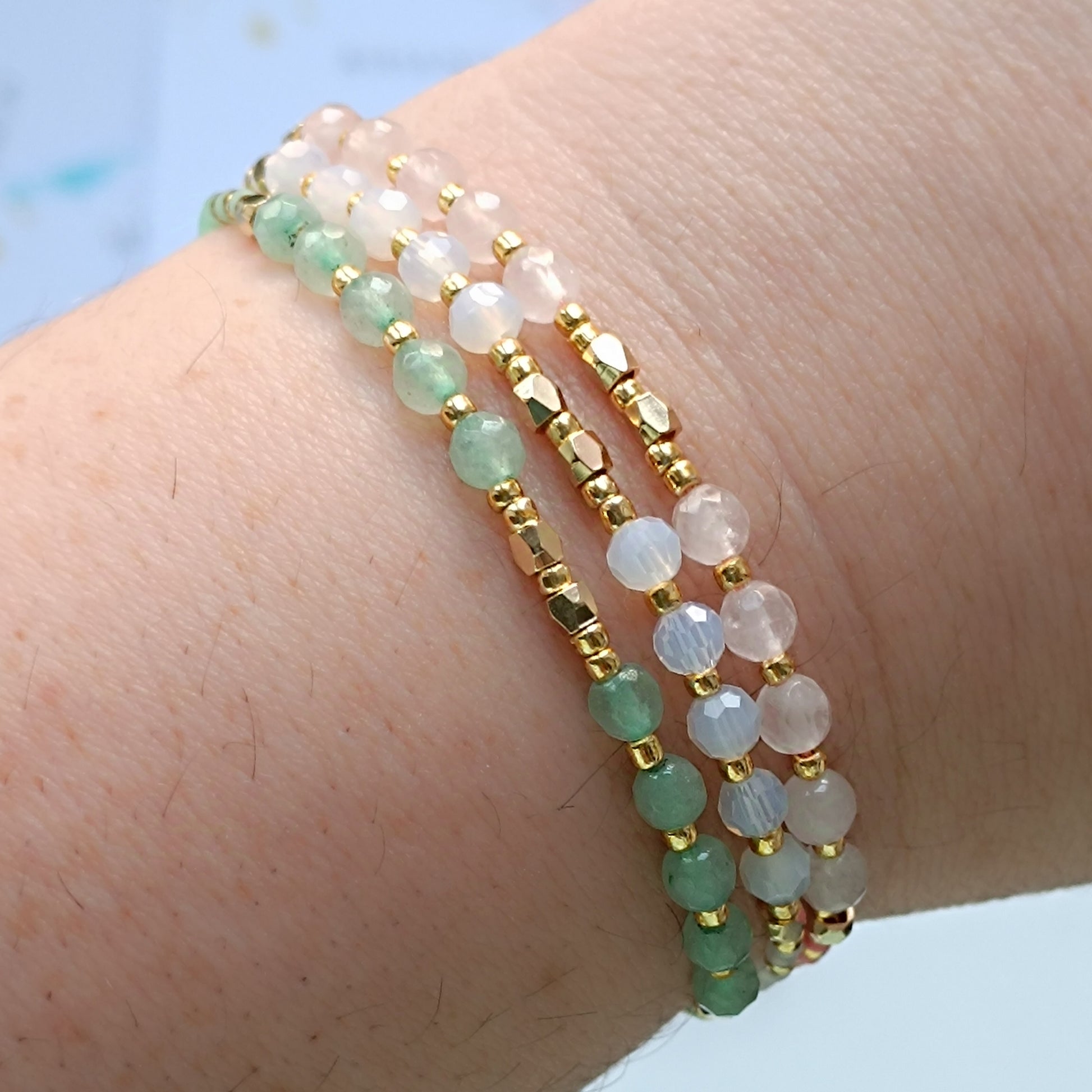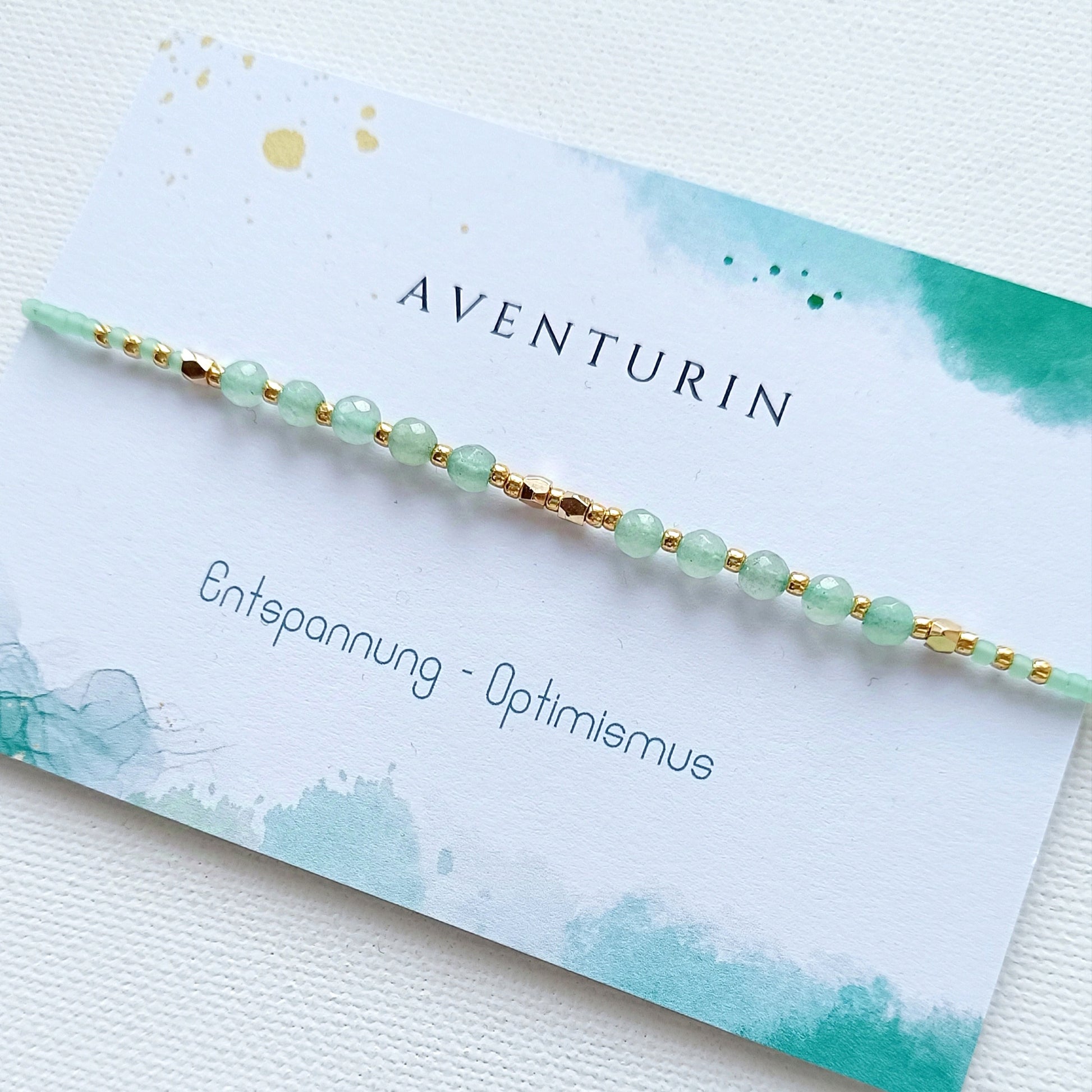Diese filigranen Armbändchen bestehen aus Natursteinen sowie winzigen Glasperlen und vergoldeten Akzenten. Edelsteine können beruhigende, entspannende oder aktivierende Eigenschaften haben. Hier wurden verarbeitet: 💚 Aventurin 🤍 Opalit 🖤 Obsidian 🩵 Howlith 🩷 Rosenquarz Die Steine sind ca. 4mm Durchmesser und sind facettiert. Zusätzlich wurden Toho Glasperlen in passenden Farbtönen sowie in Gold und 18k vergoldete Akzentperlen eingearbeitet. Das Amband ist durch den Makrameeknoten individuell von 17,5 - ca. 25cm verstellbar. Mit der auf hochwertigen Fotokarton gedruckten Geschenkkarte ist das Armbändchen ein wunderschönes Geschenk für einen besonderen Menschen in deinem Leben!