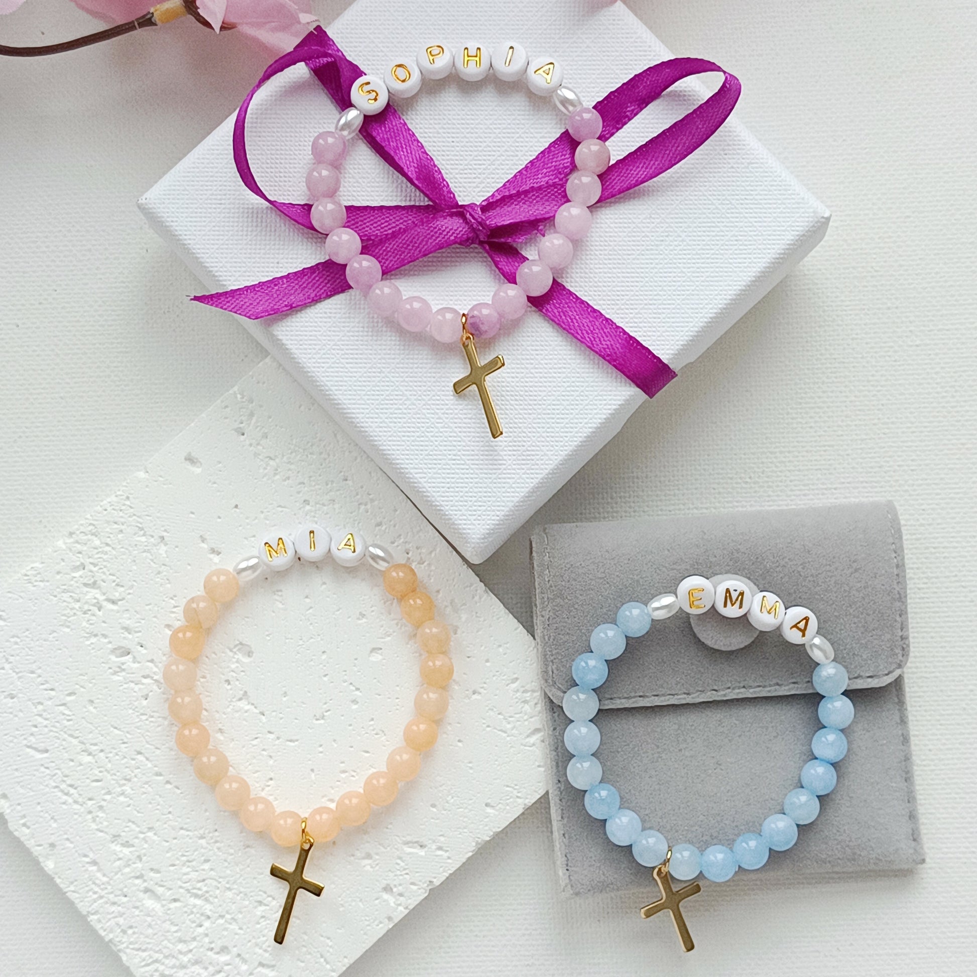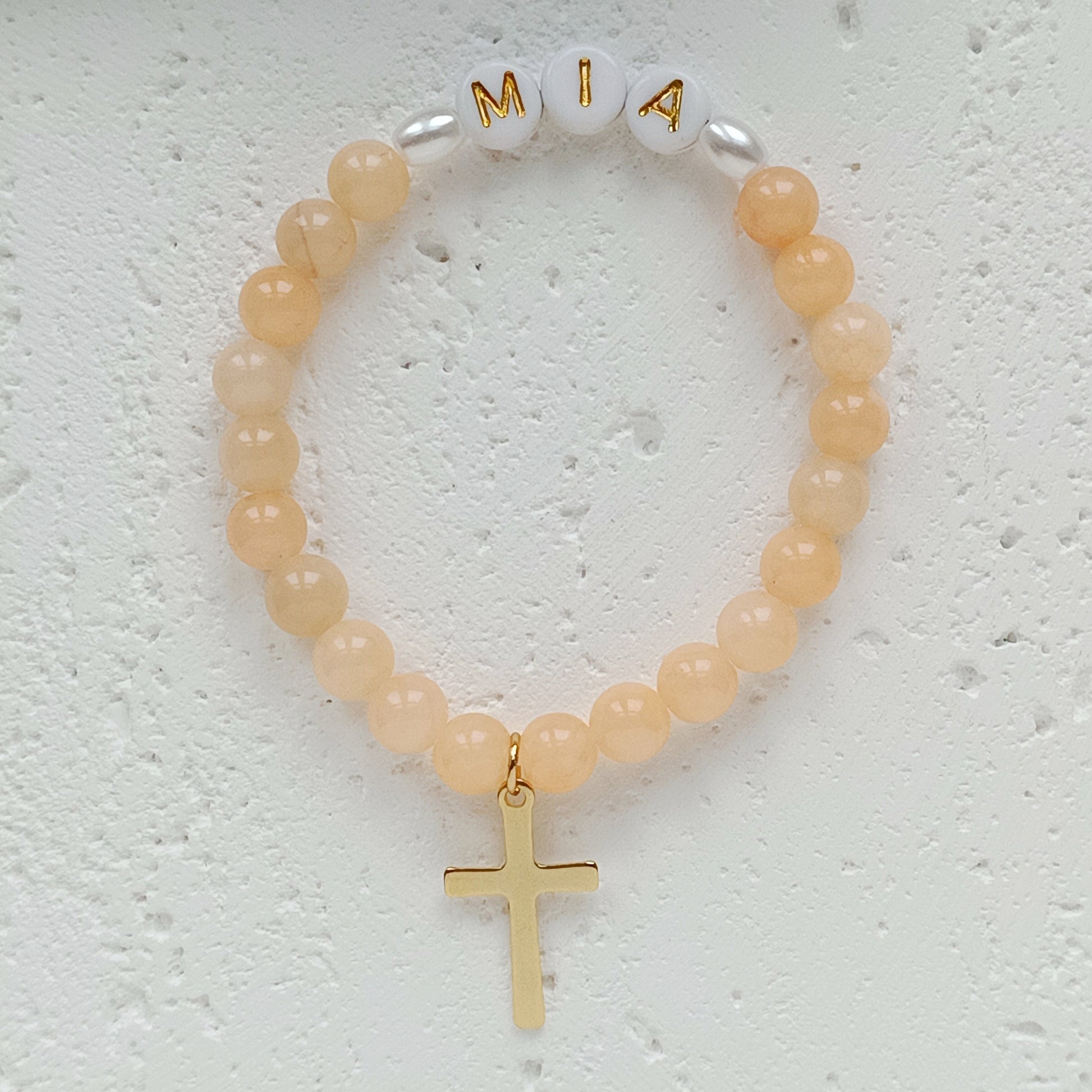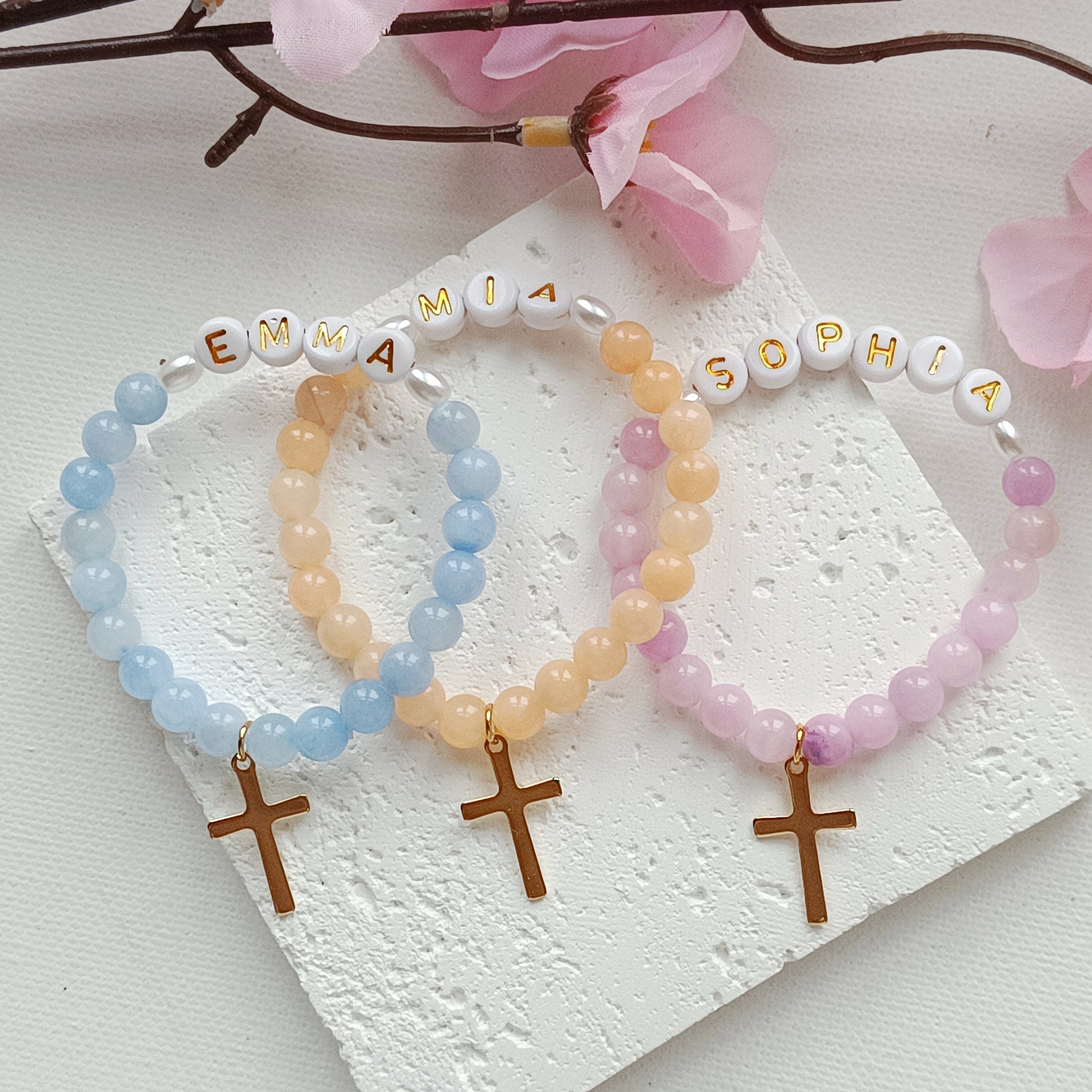 Süßes Perlenarmband mit Name und Kreuzanhänger für Mädchen. Perfekt als Geschenk zur Erstkommunion.