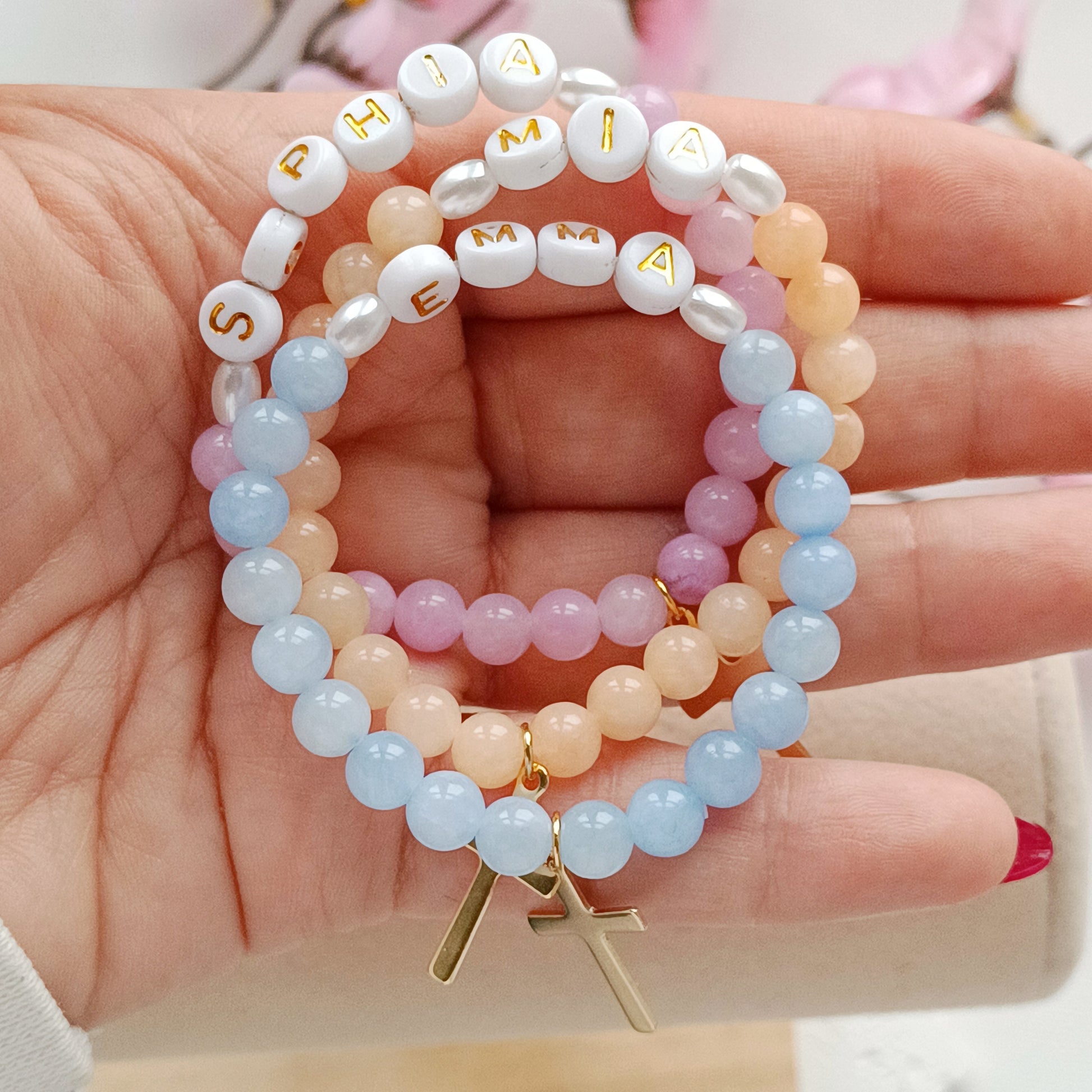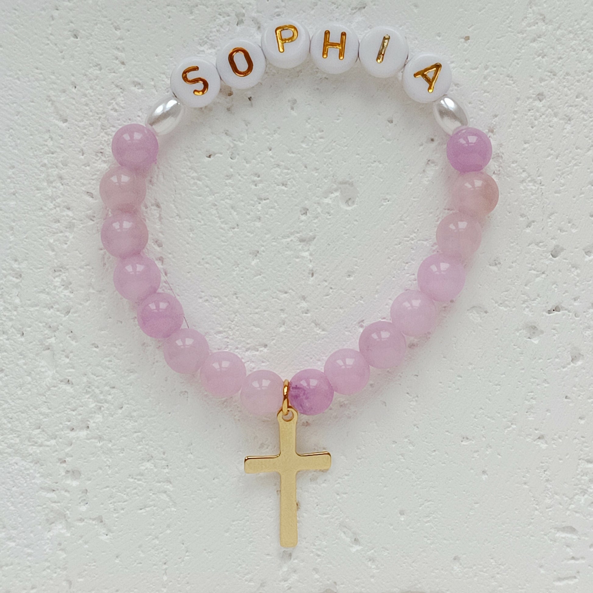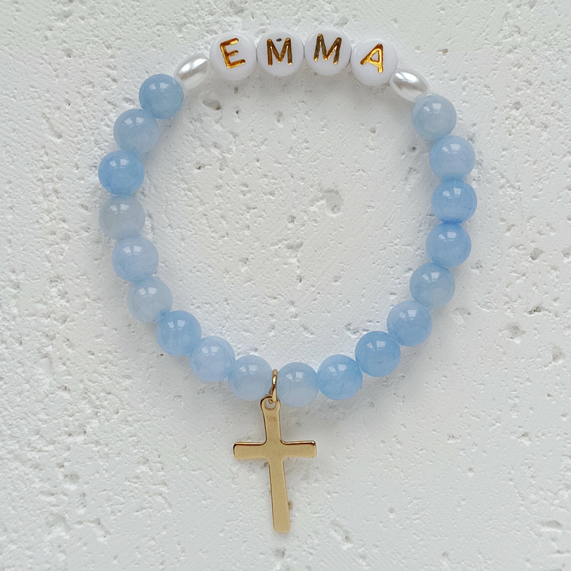 Süßes Perlenarmband mit Name und Kreuzanhänger für Mädchen. Perfekt als Geschenk zur Erstkommunion.