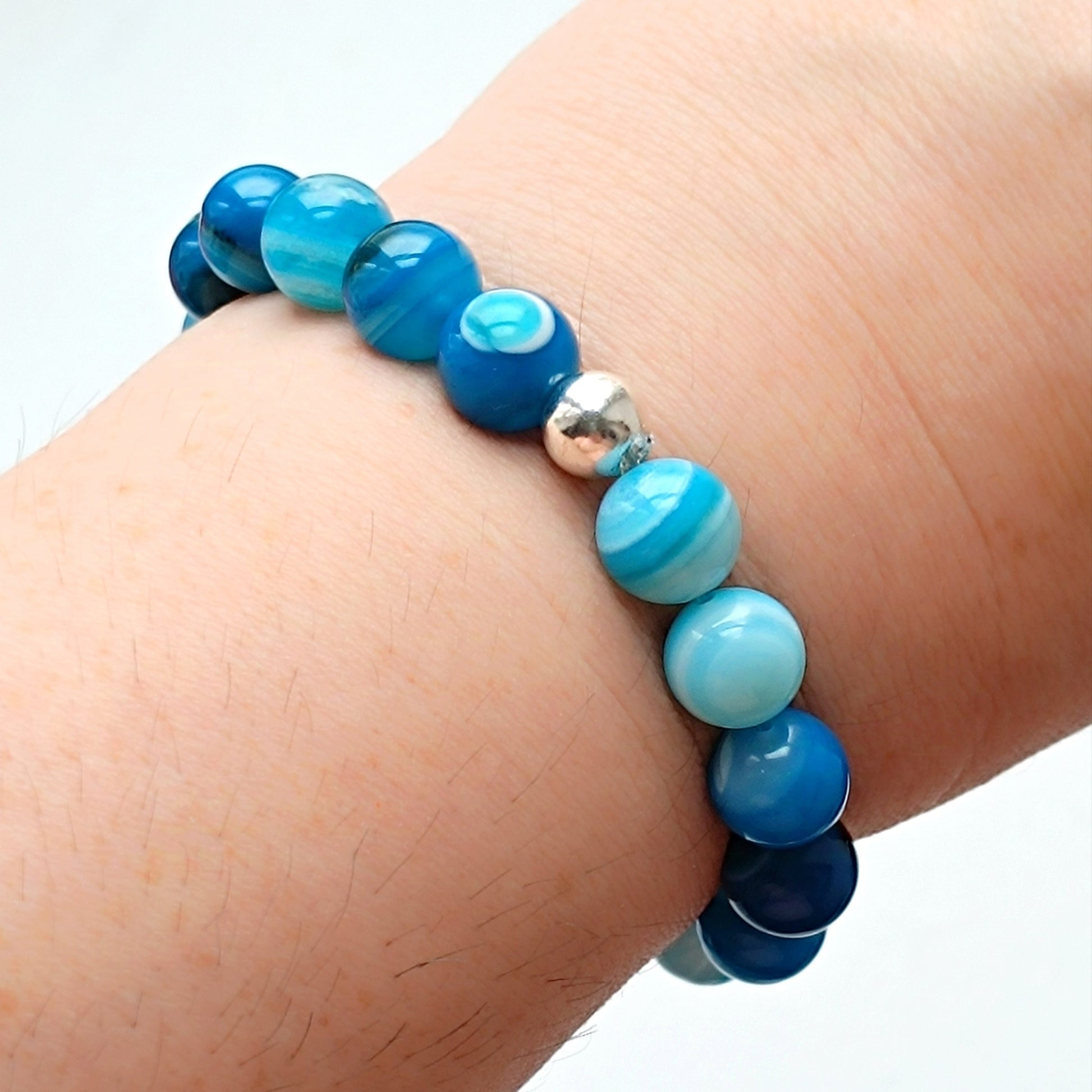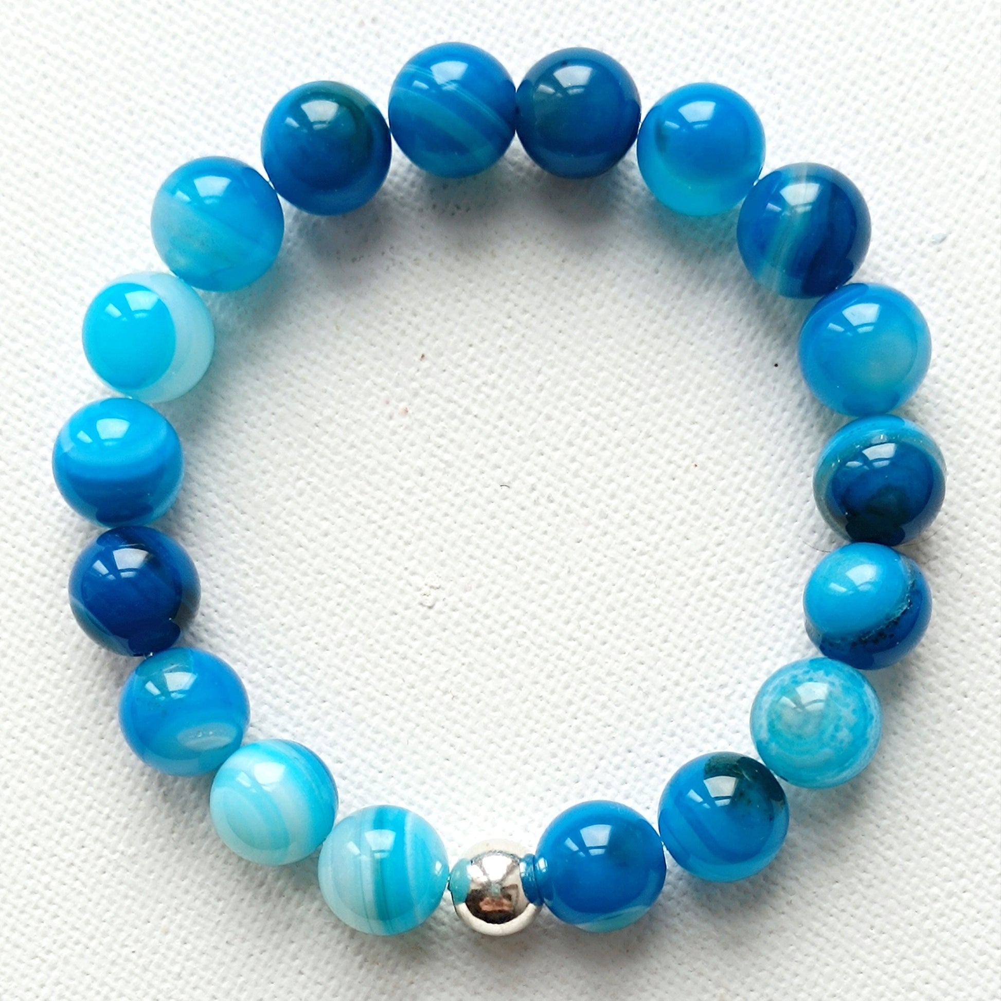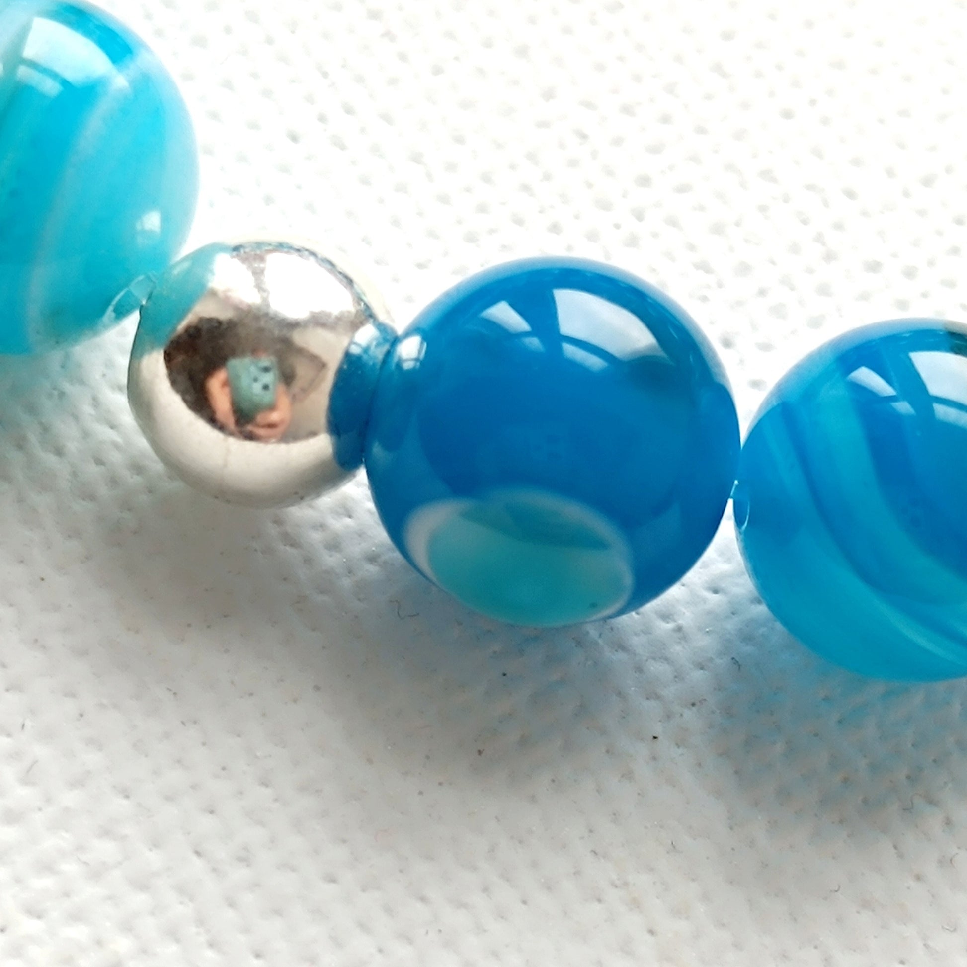 Mit dem Statement Armband aus strahlend blauen Achatperlen setzt du modische Akzente. Eine silber plattierte Edelstahlperle habe ich als zusätzlichen Blickfang hinzugefügt.