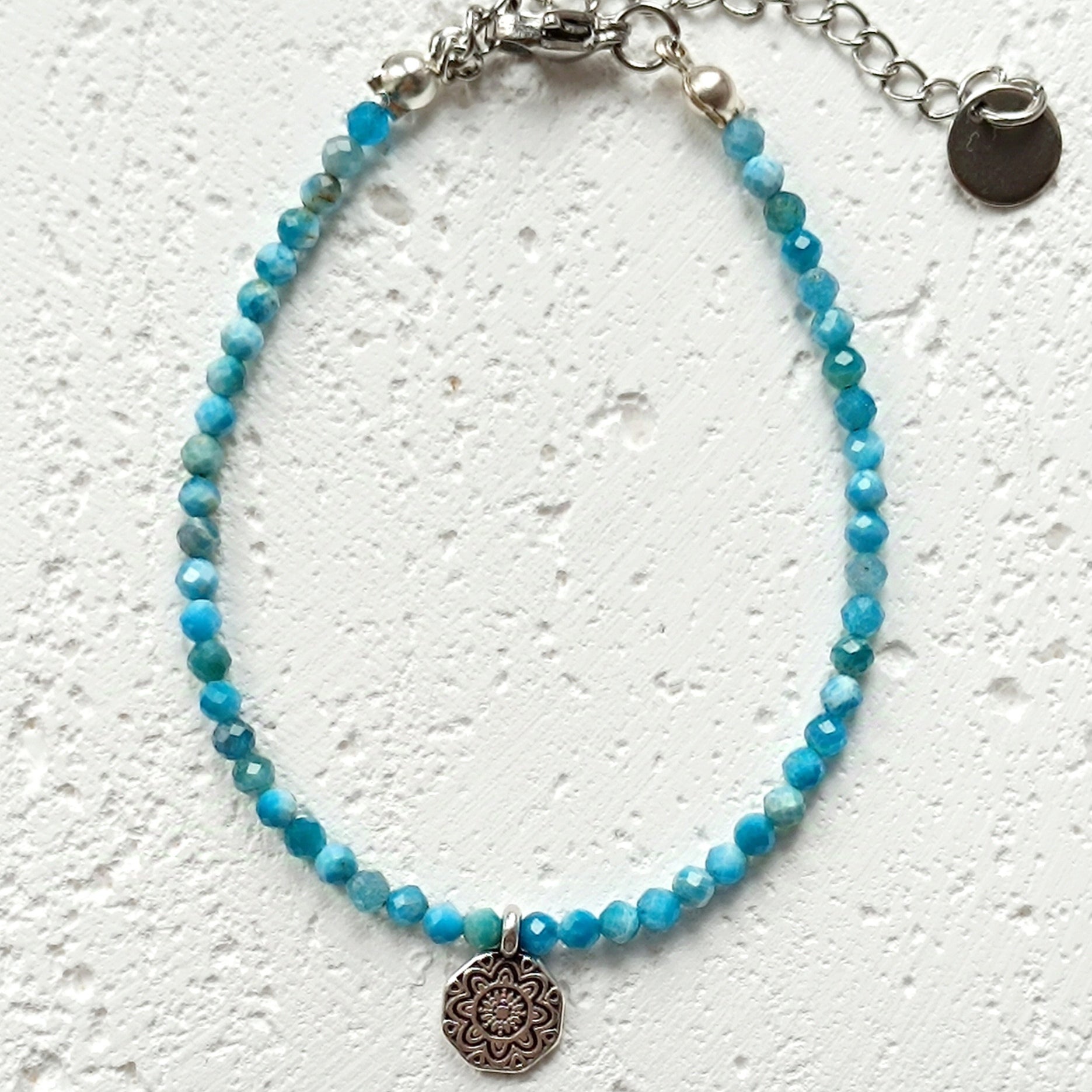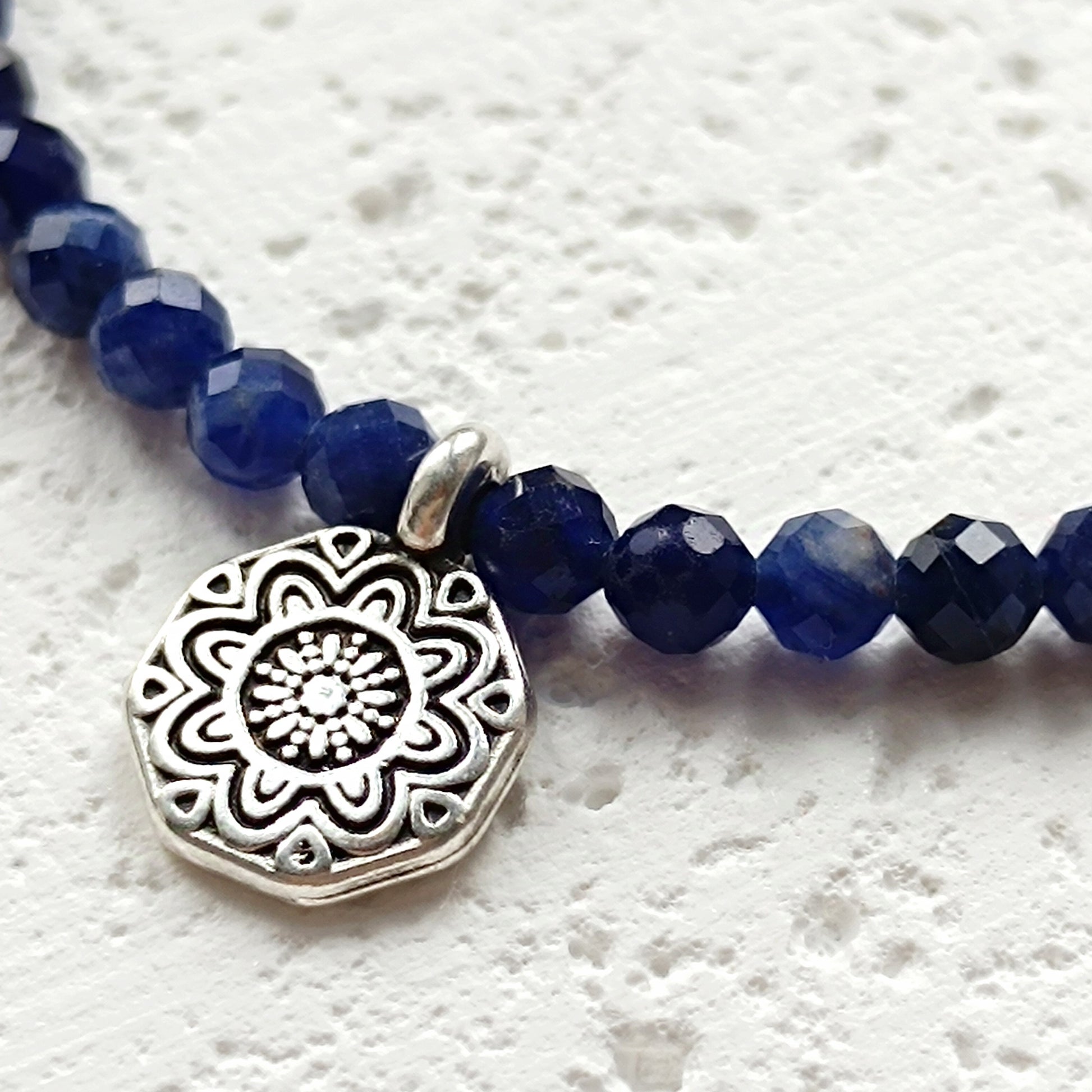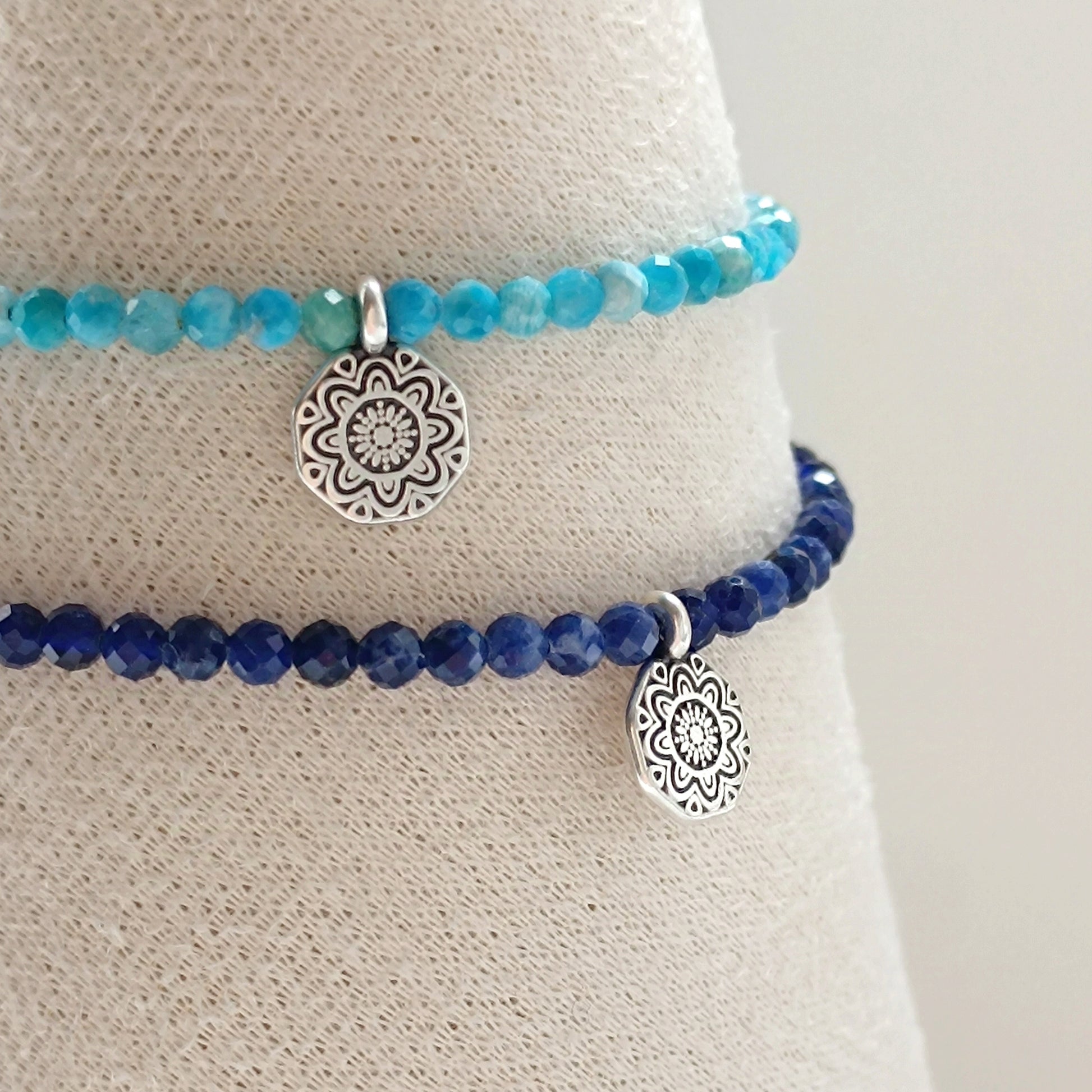 Die Armbänder bestehen aus kleinen facettierten Apatit- oder Sodalithperlen. Beide sind Steine für den Schützen und gelten als Schutz- und Glücksstein.