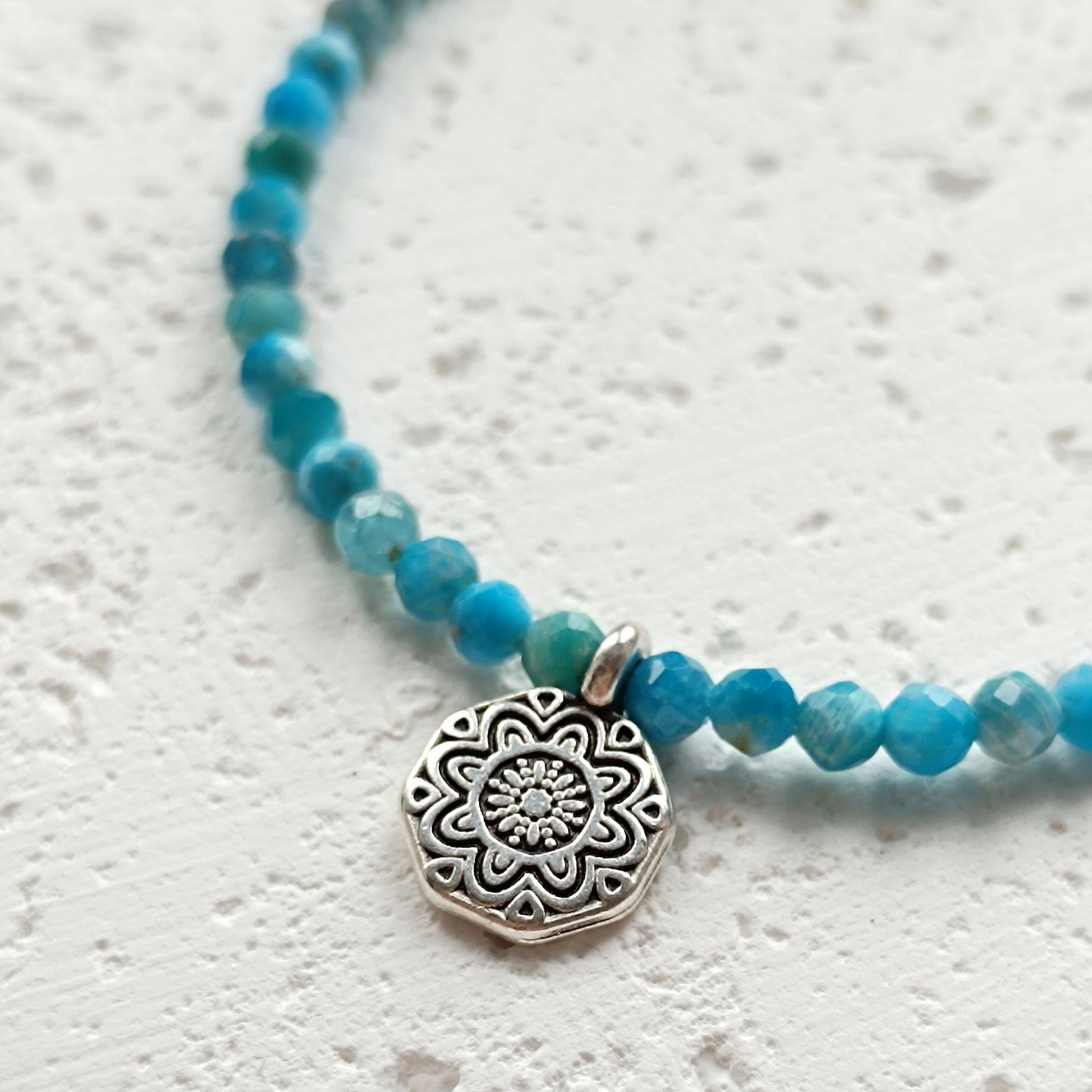 Ein Mandala Anhänger in silber ist zusätzlich ein kleiner Blickfang. Mit Karabiner zum verschließen und mit Verlängerungskette versehen.