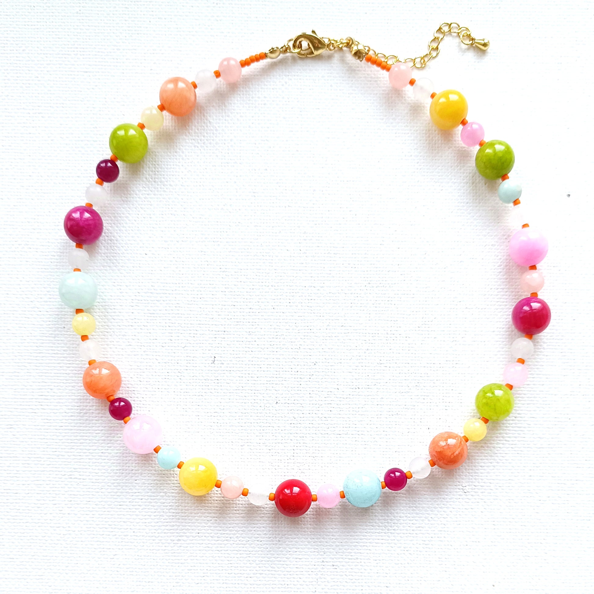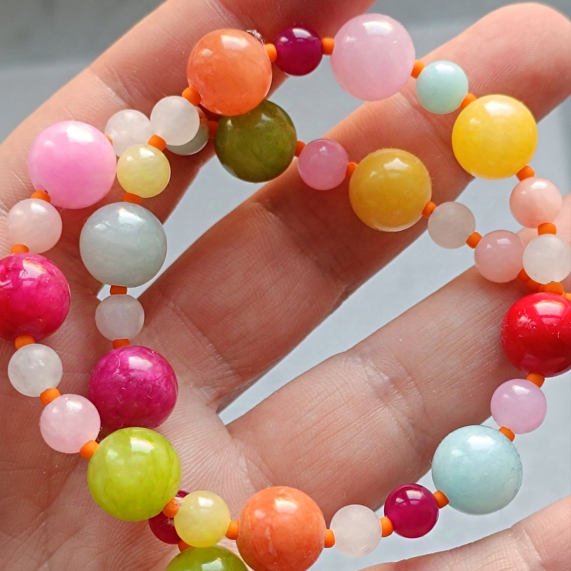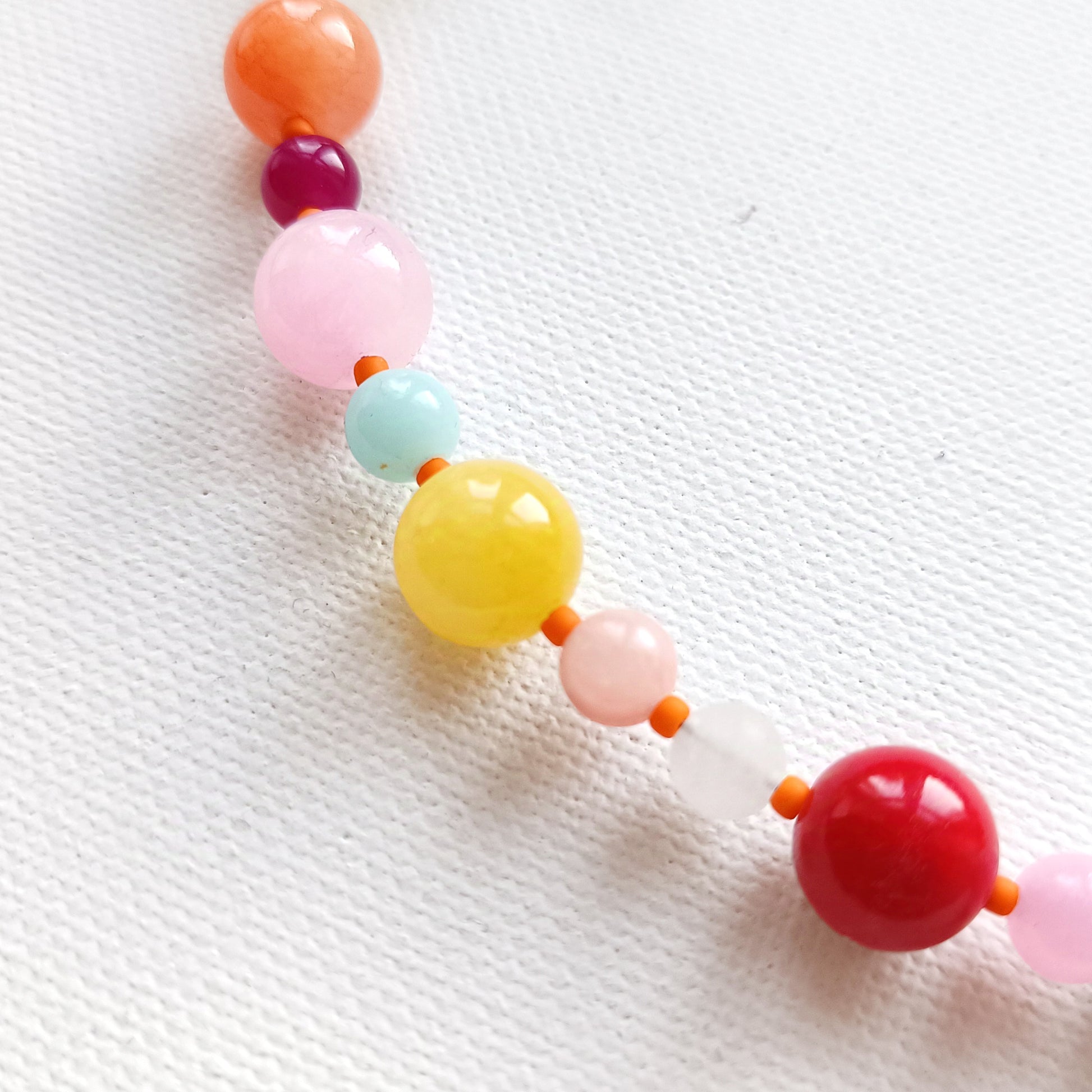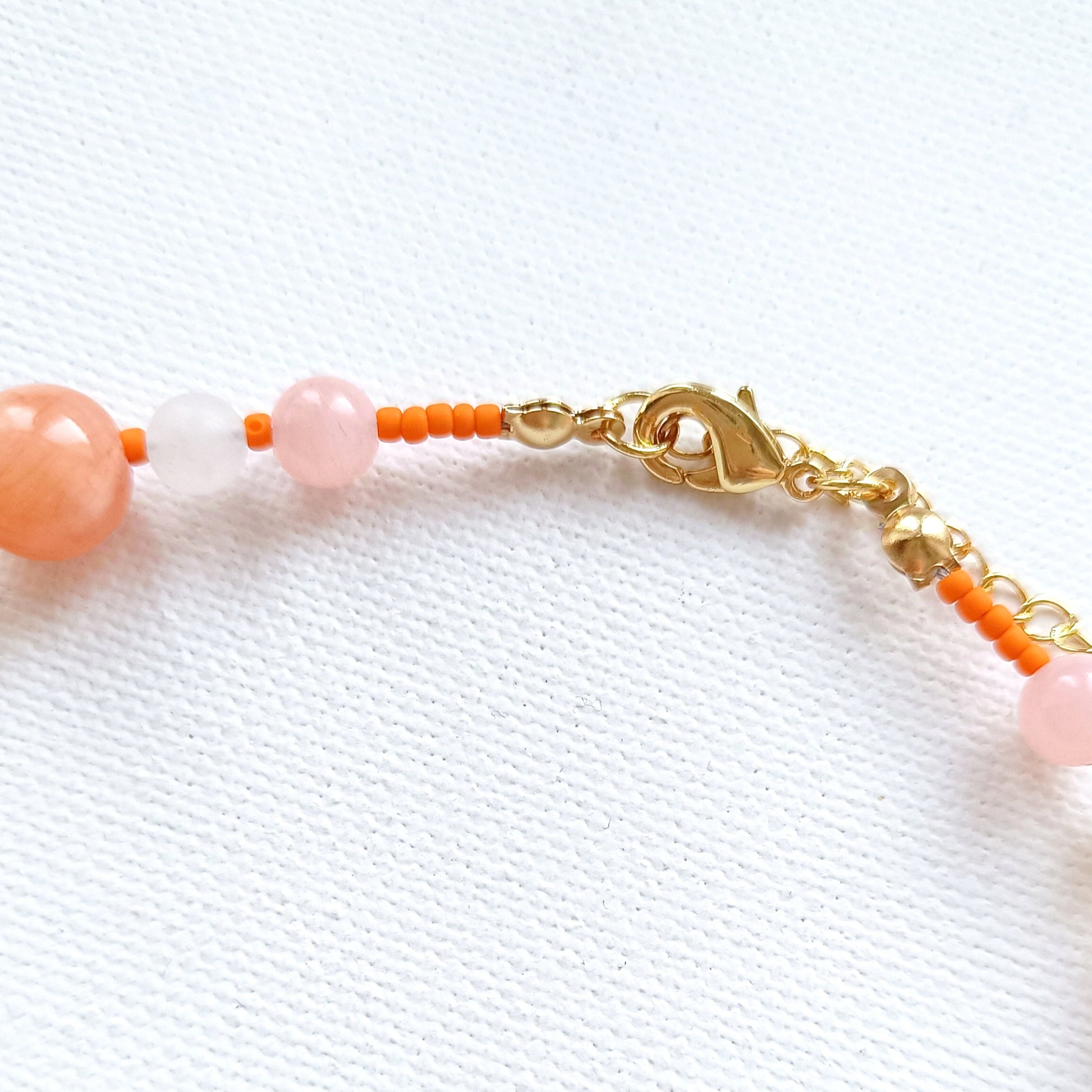 Es wurden verschiedenfarbige Jade Kugeln sowie orangene Toho Glas Rocailles verarbeitet.