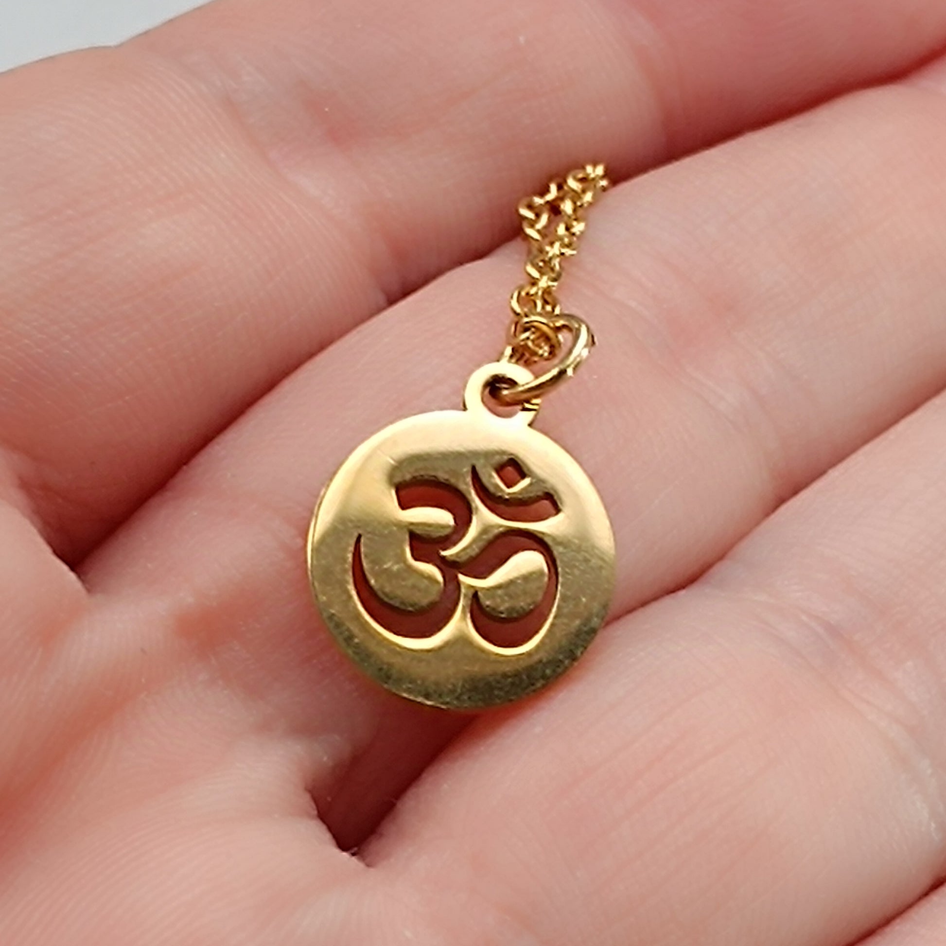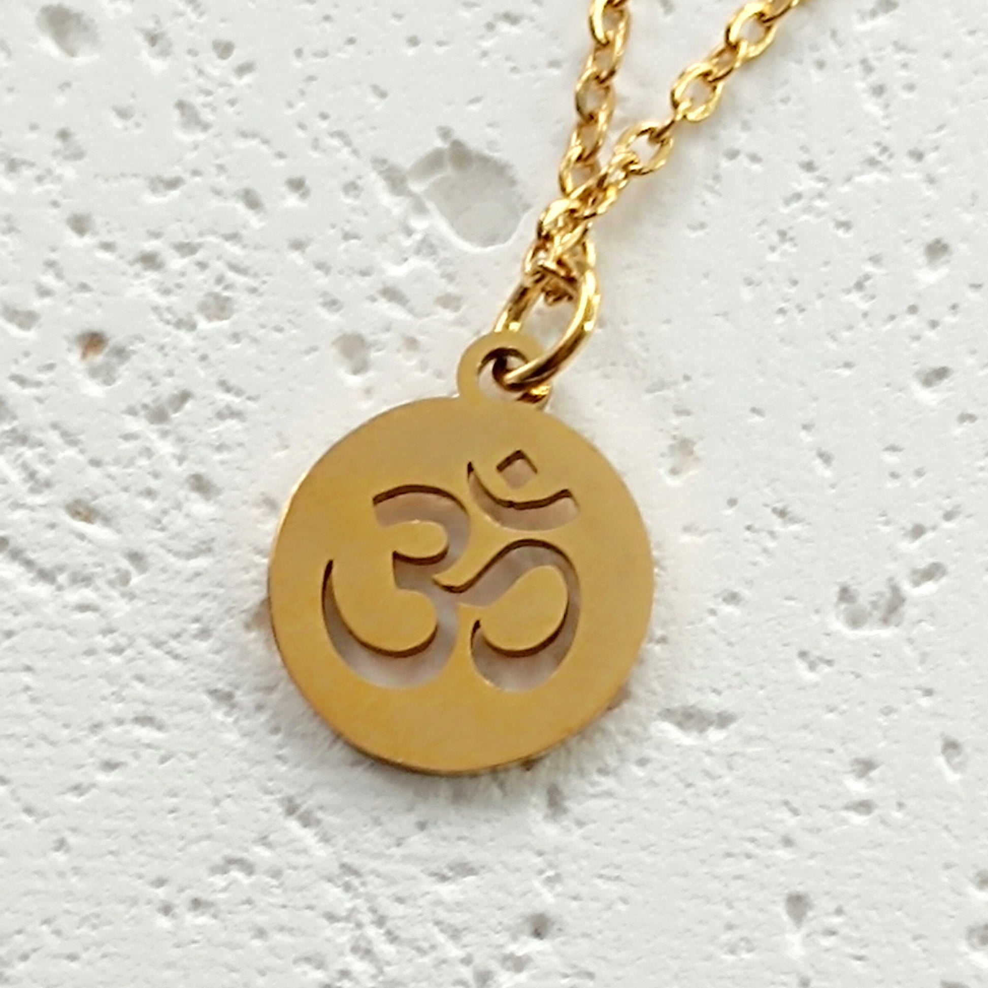 Feine Gliederkette aus Edelstahl mit runde Anhänger mit Om Symbol.