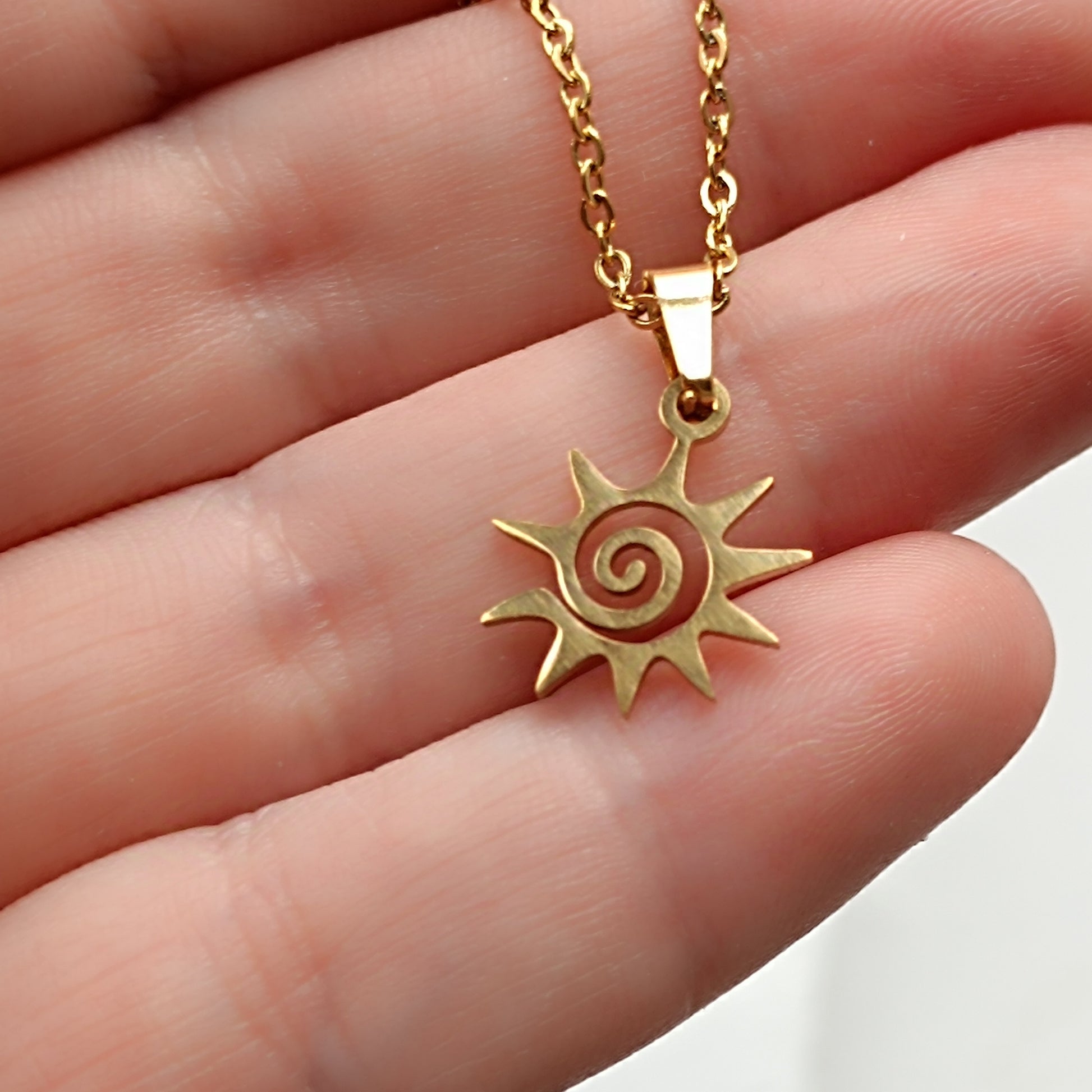 Feine Gliederkette aus Edelstahl mit Sonnenanhänger mit Spiralmuster.