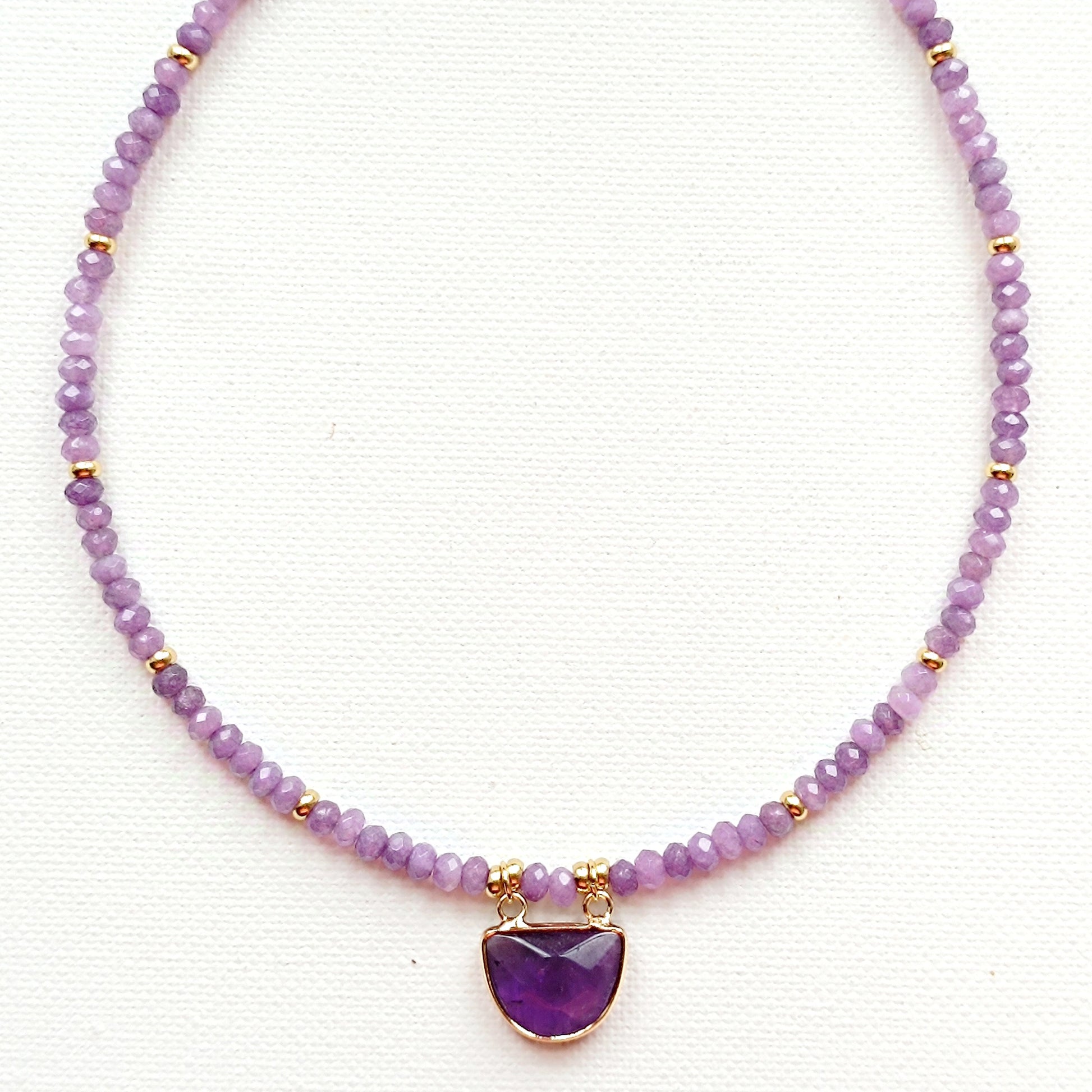 Diese edle und stylische kurze Halskette aus gefärbten Jade-Rondellen und einem halbrunden Anhänger aus Amethyst bringt Eleganz und Farbe in dein Herbst Outfit.