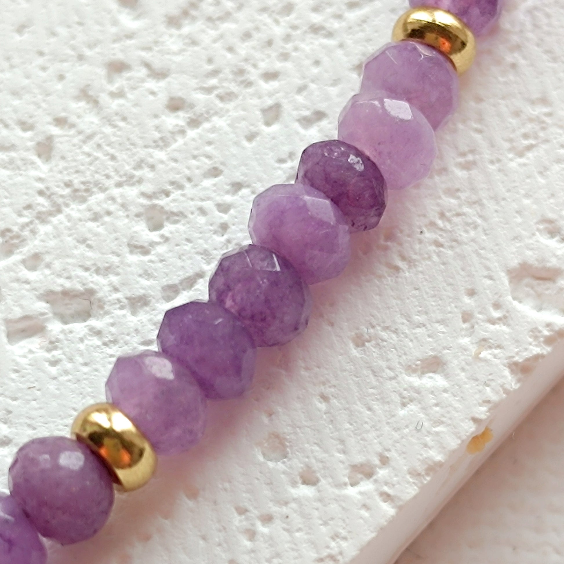Die zarten, lila Töne des Amethysts harmonieren wunderbar mit den lebendigen Farben der Jade, was der Kette ein einzigartiges und auffälliges Aussehen verleiht.