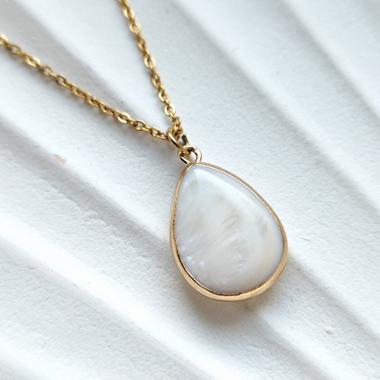 Goldene feingliedrige Edelstahlkette mit Süsswassermuschelanhänger in Tropfenform. Der Muschelkrug ist in goldfarbenem Messing eingefaßt. Einzeln oder gepaart mit Anderen Ketten zu tragen. Ein süßer Hingucker für den kommenden Frühling und Sommer.