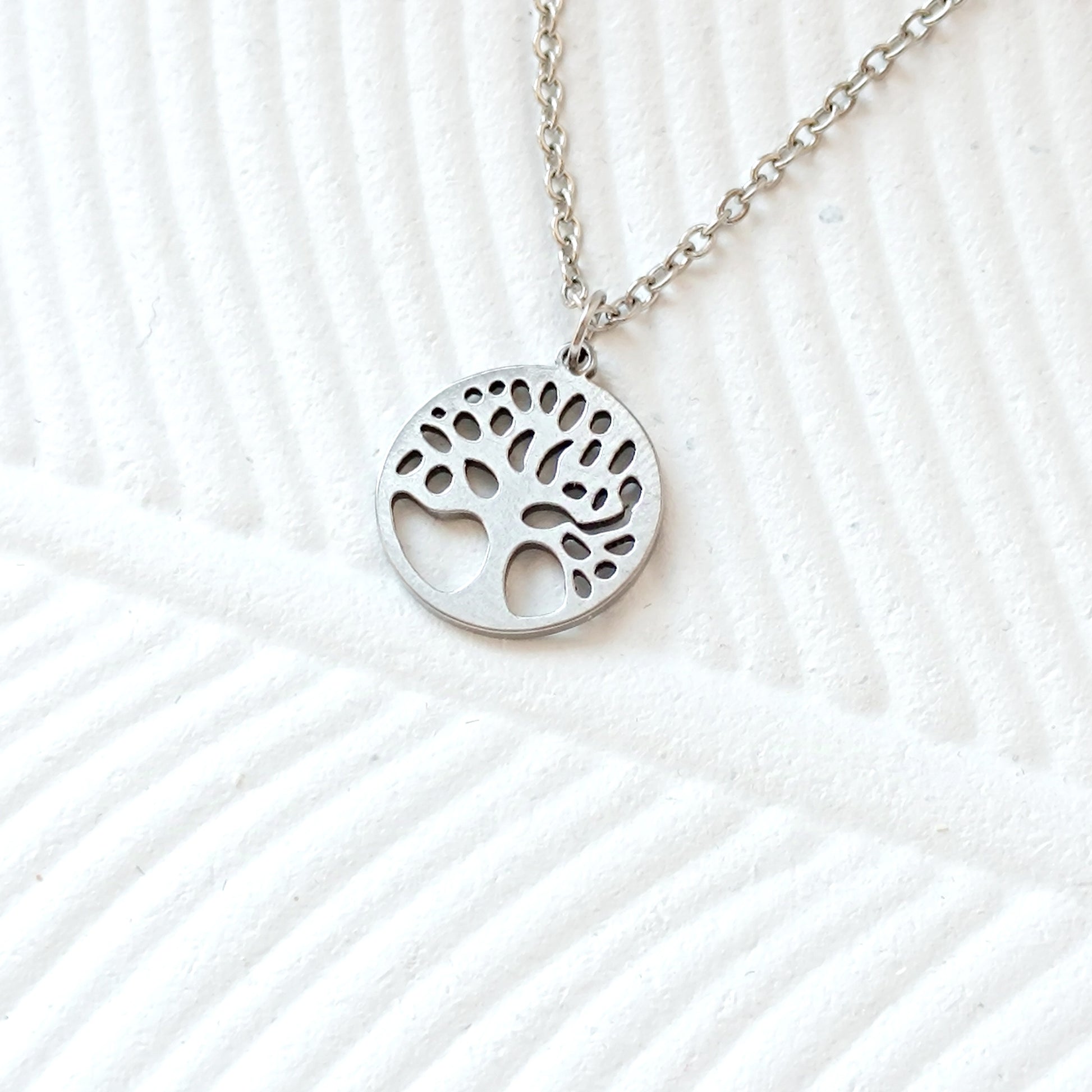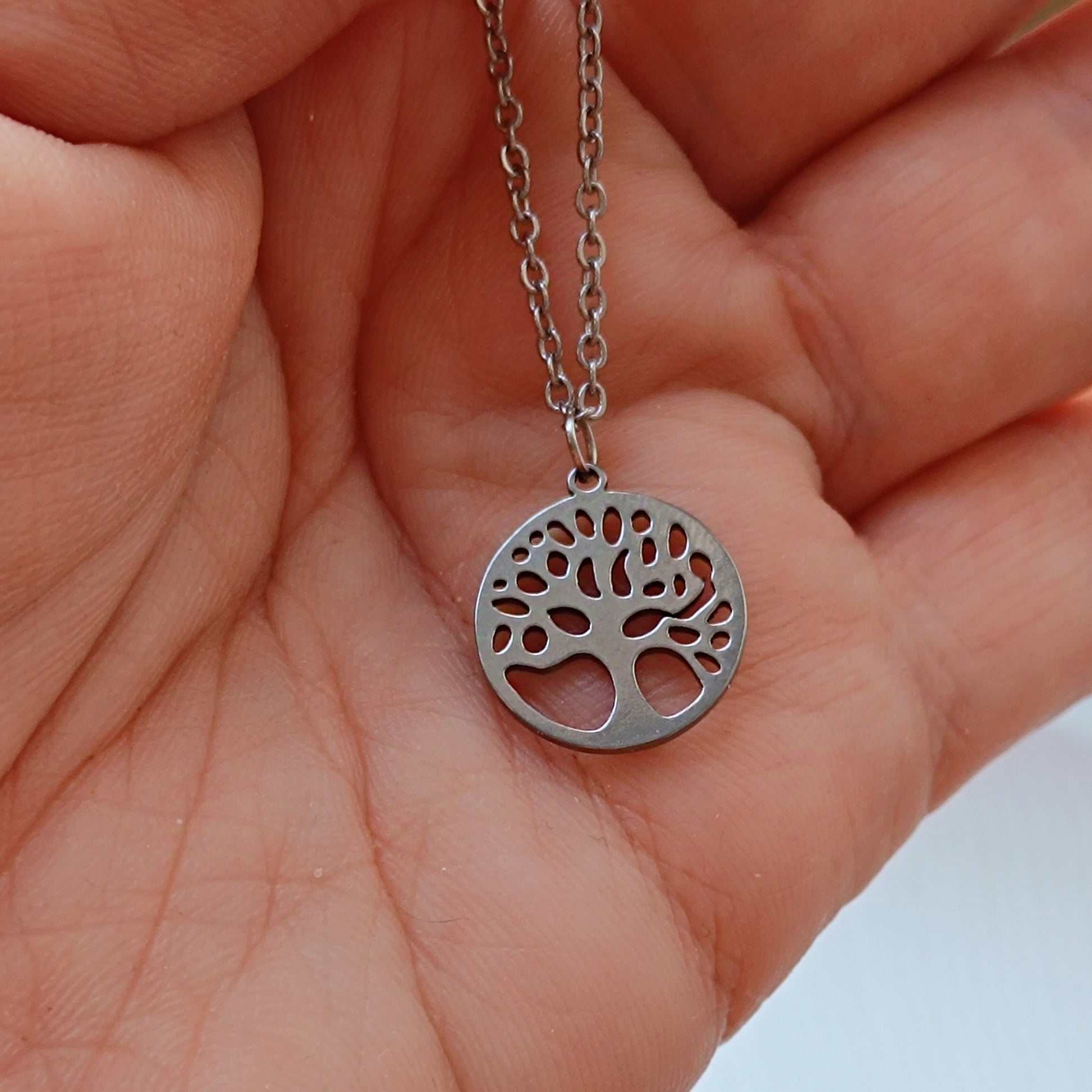 Dezente und schöne Edelstahlkette mit rundem Lebensbaumanhänger.
