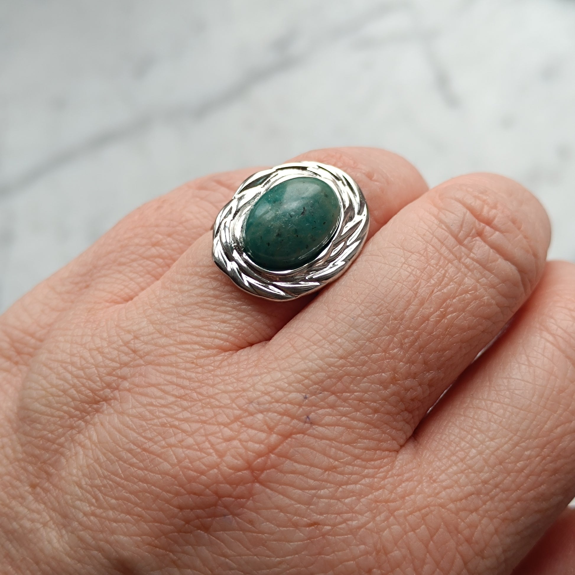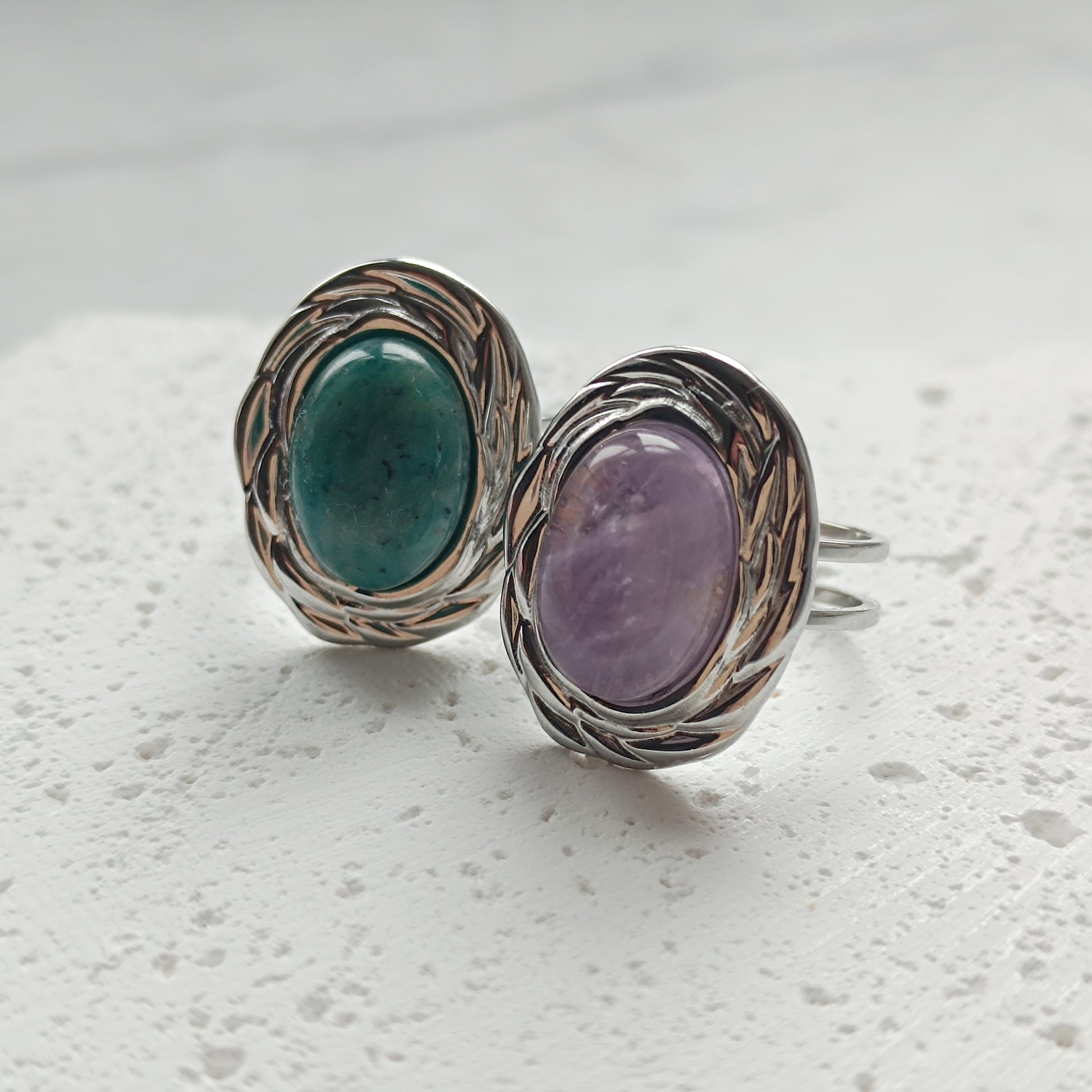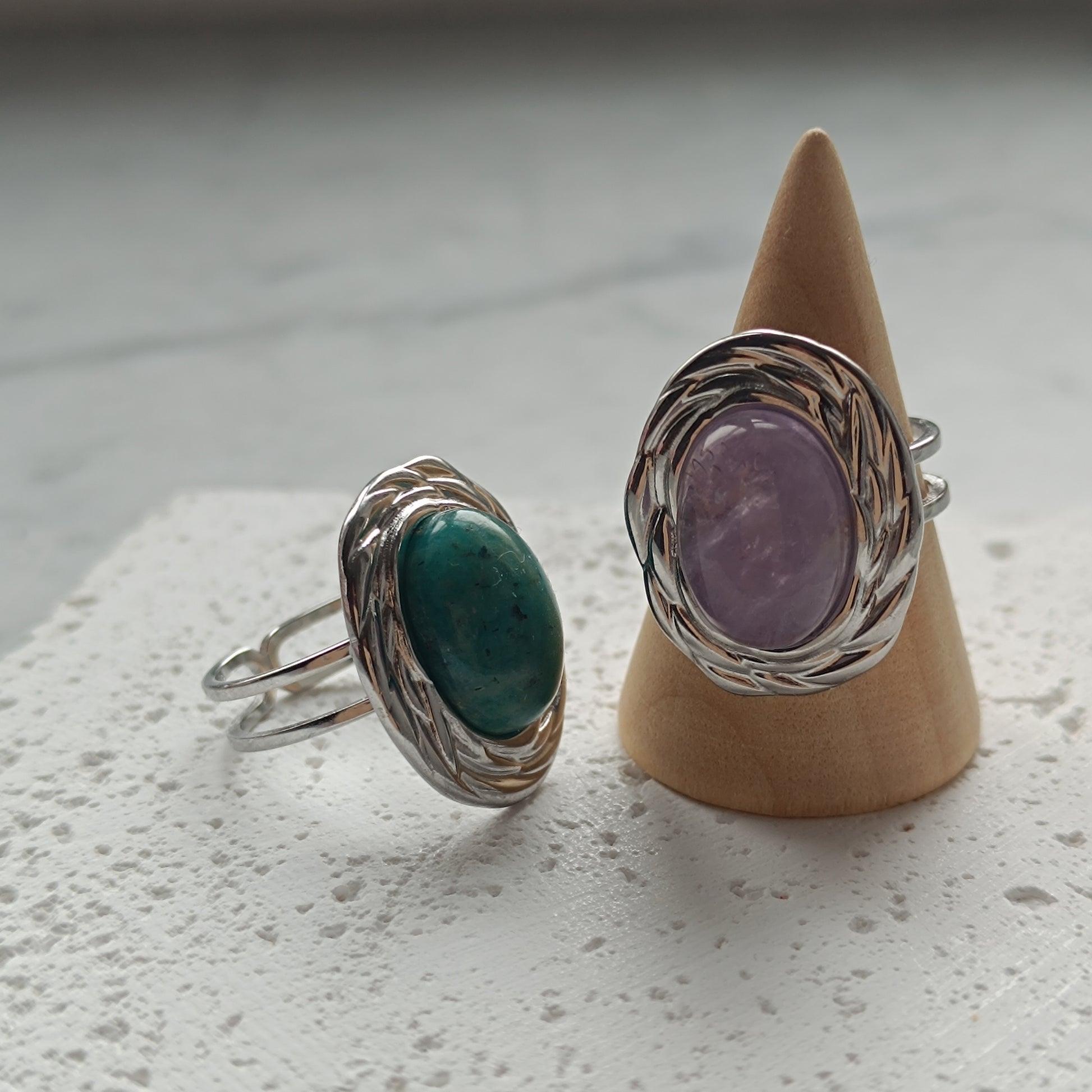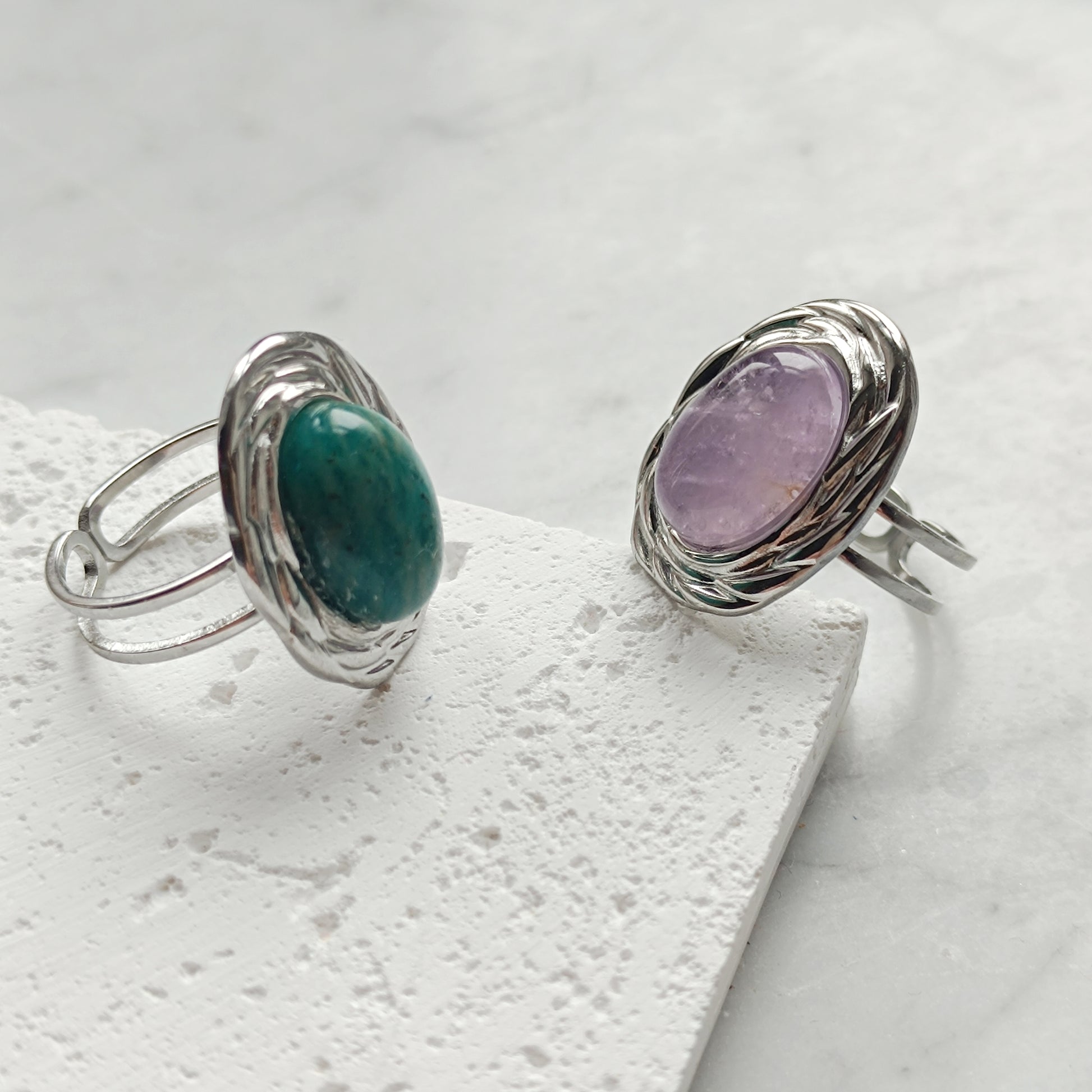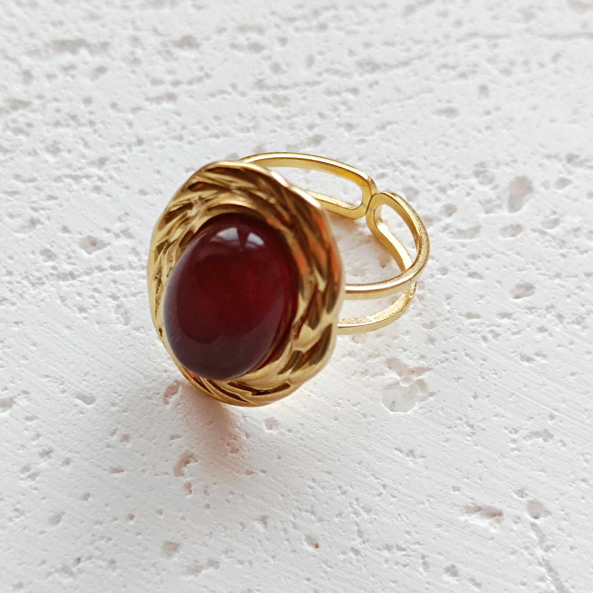 Ring aus Edelstahl mit Umrandung und Edelstein Cabochon, an der Rückseite offen