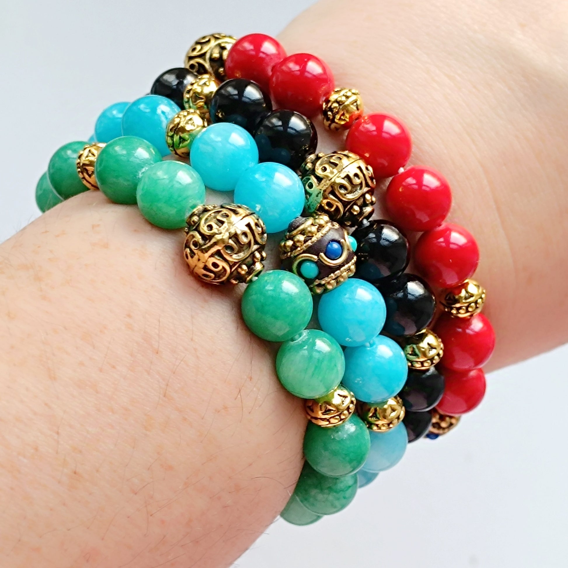 Neue Statement Armbänder im Ethnostil aus großen gefärbten Jadeperlen kombiniert mit antik goldenen Tibetperlen mit verschiedenen Ornamenten und Mustern.