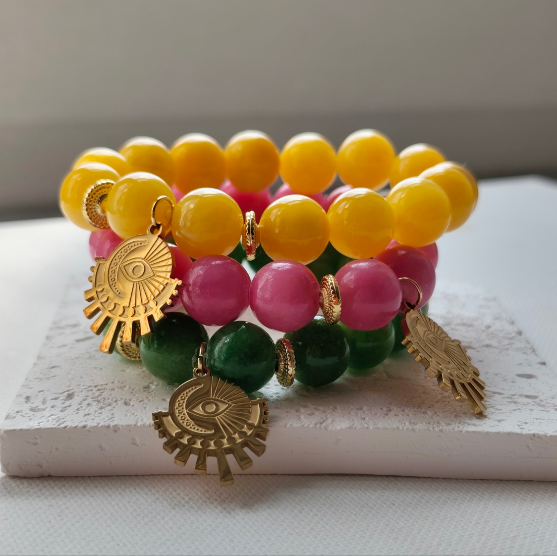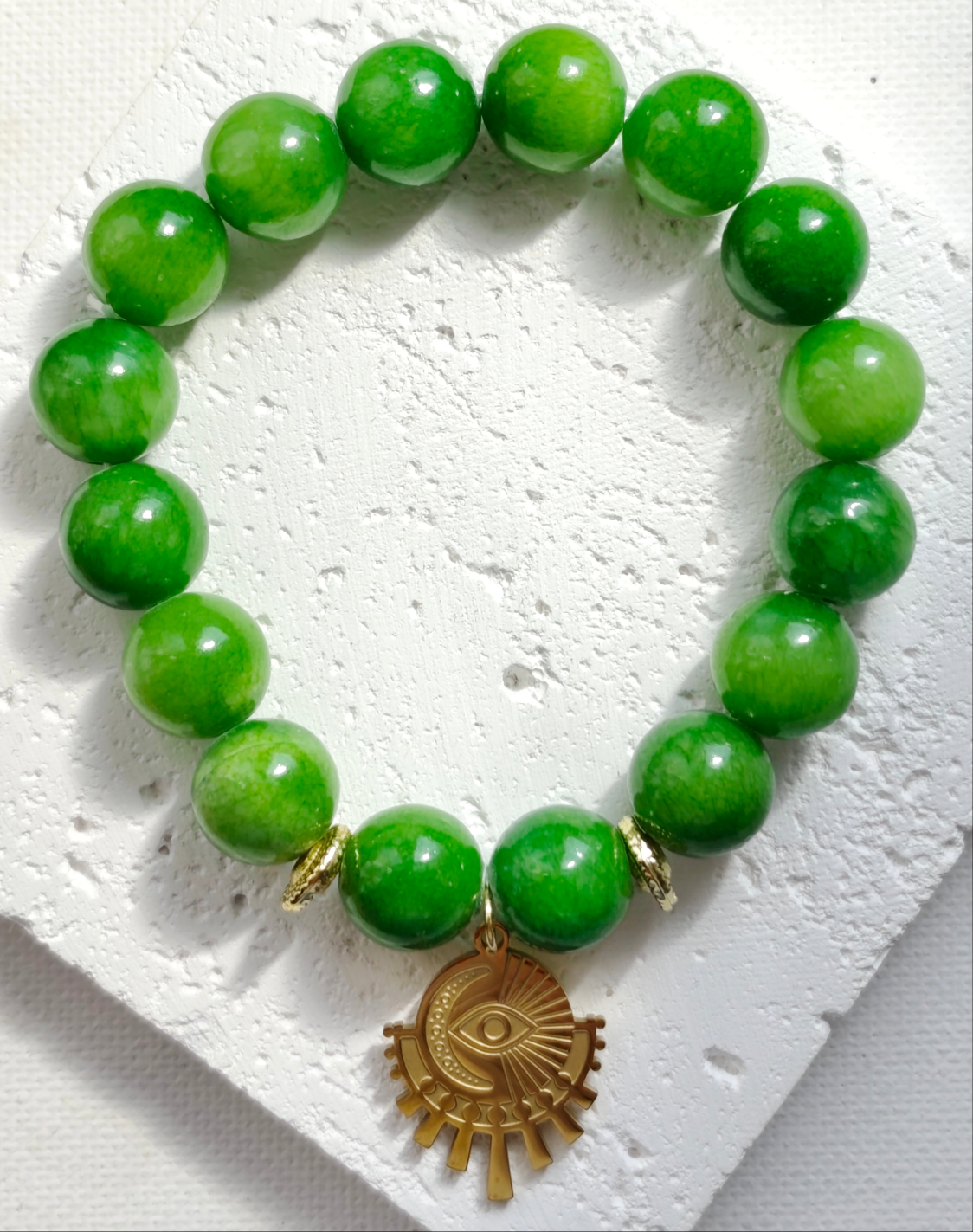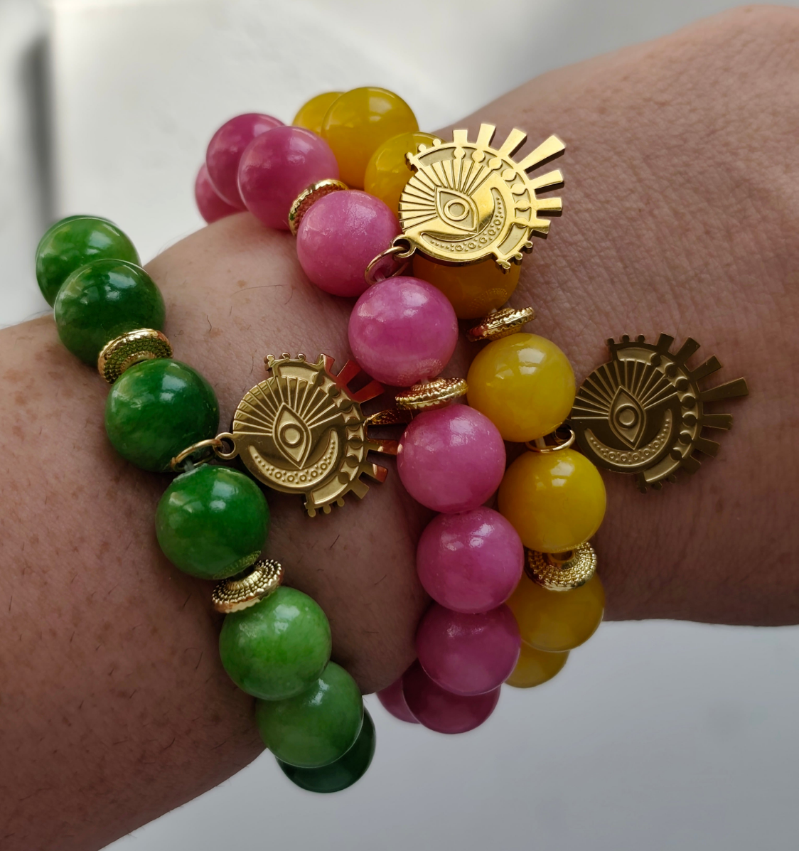 Statement Armband aus gefärbten Jade Kugeln mit vergoldetem Anhänger mit Sonne und Augenmotiv
