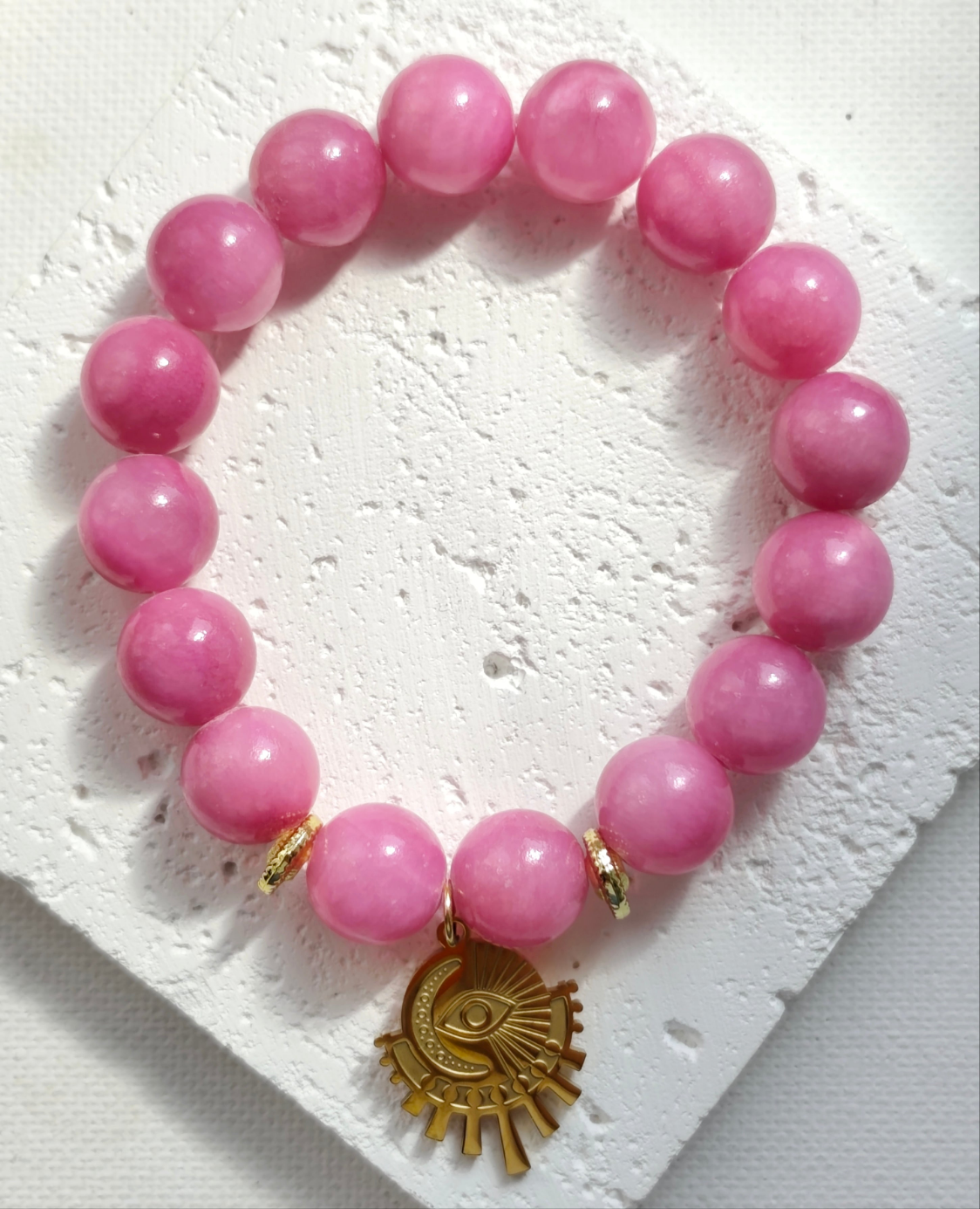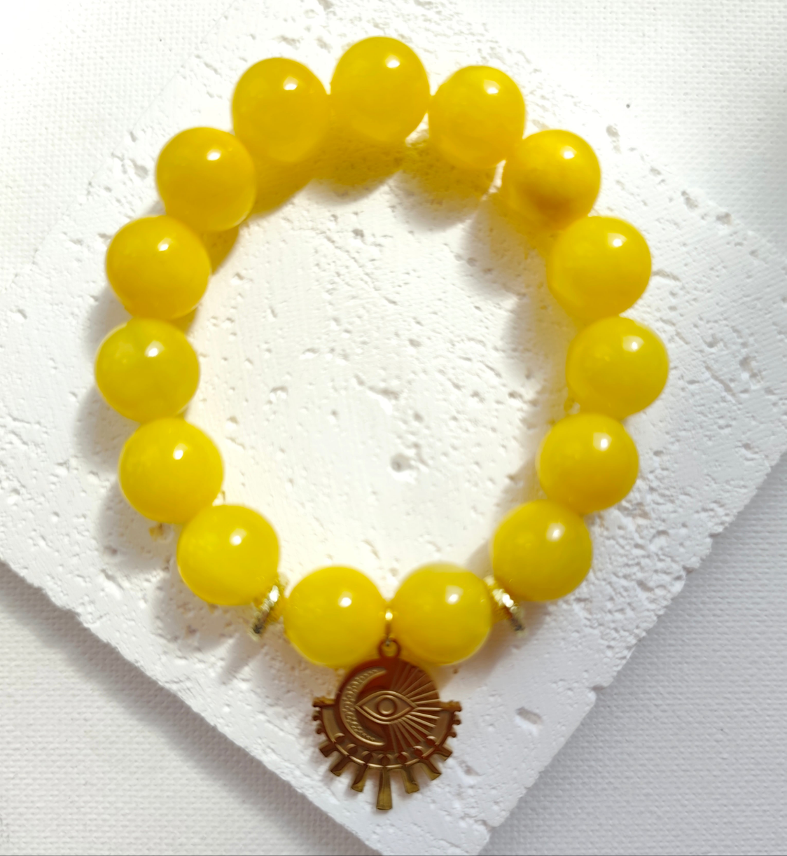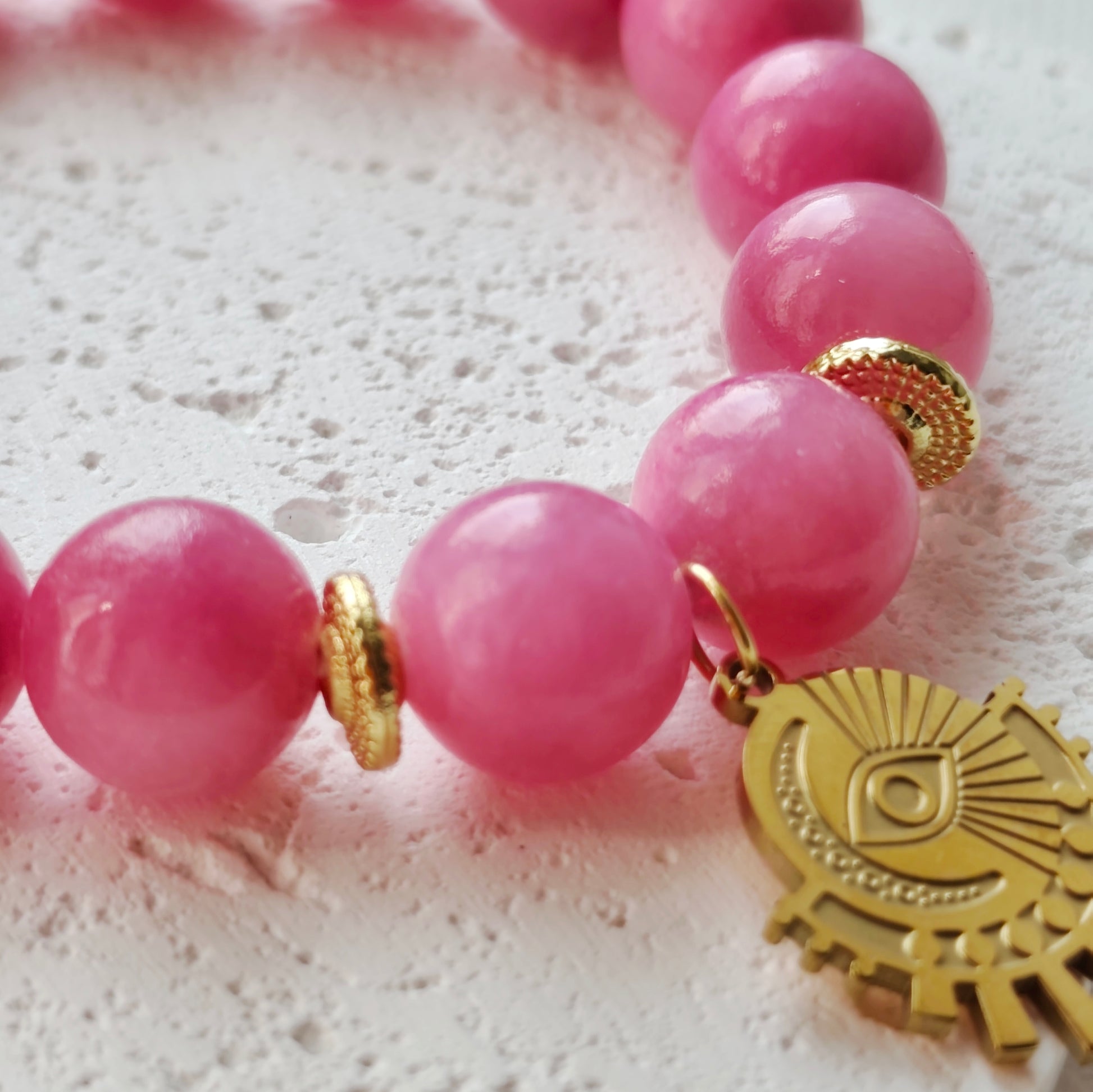 Statement Armband aus gefärbten Jade Kugeln mit vergoldetem Anhänger mit Sonne und Augenmotiv