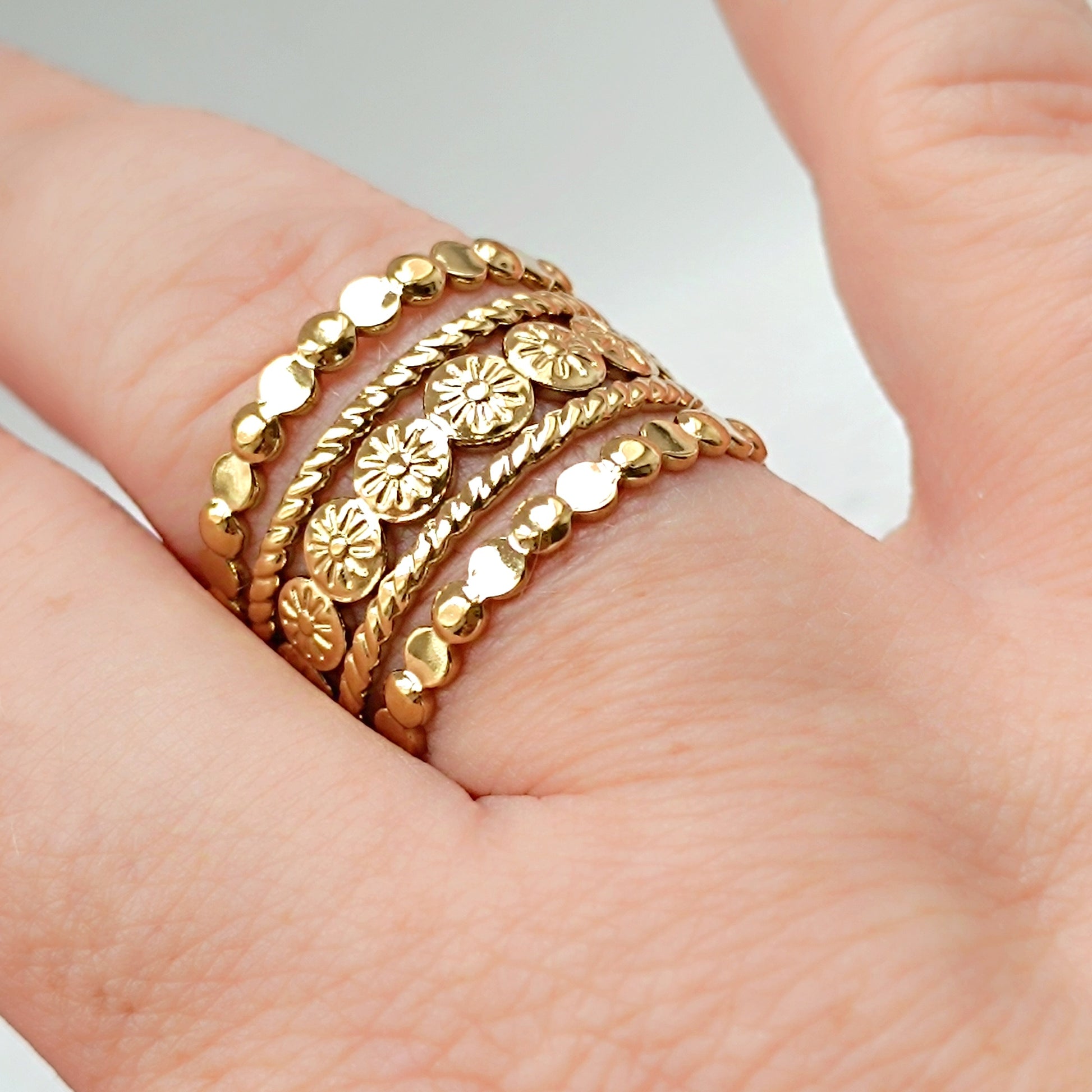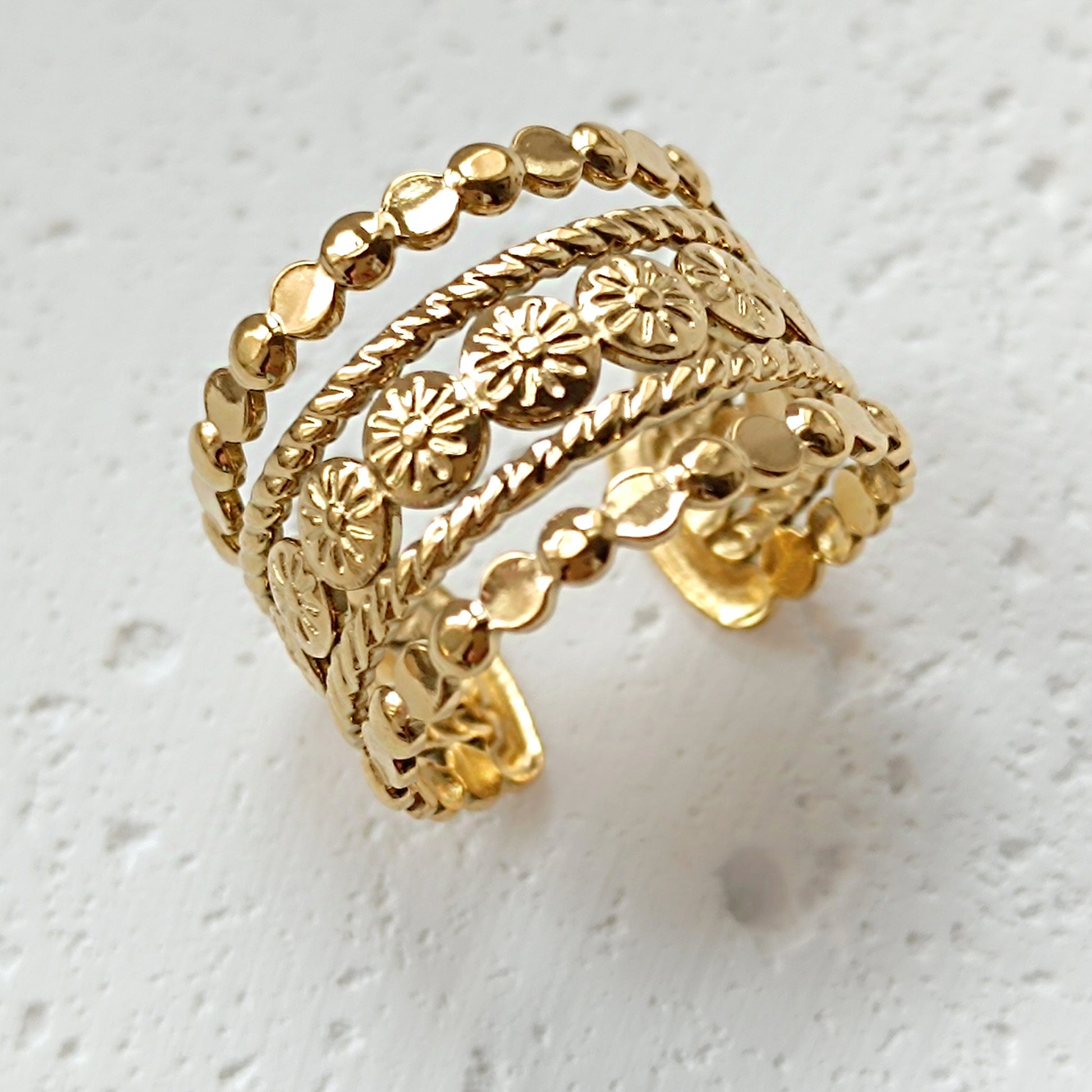 Cooler Statement Ring in 5 Reihen im trendigen Stapel Look. An der Rückseite ist der Ring offen und kann auch auf verschiedene Fingergrößen eingestellt werden.