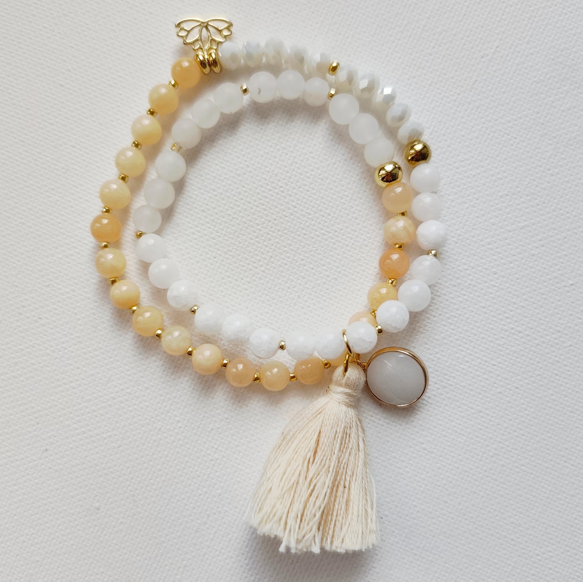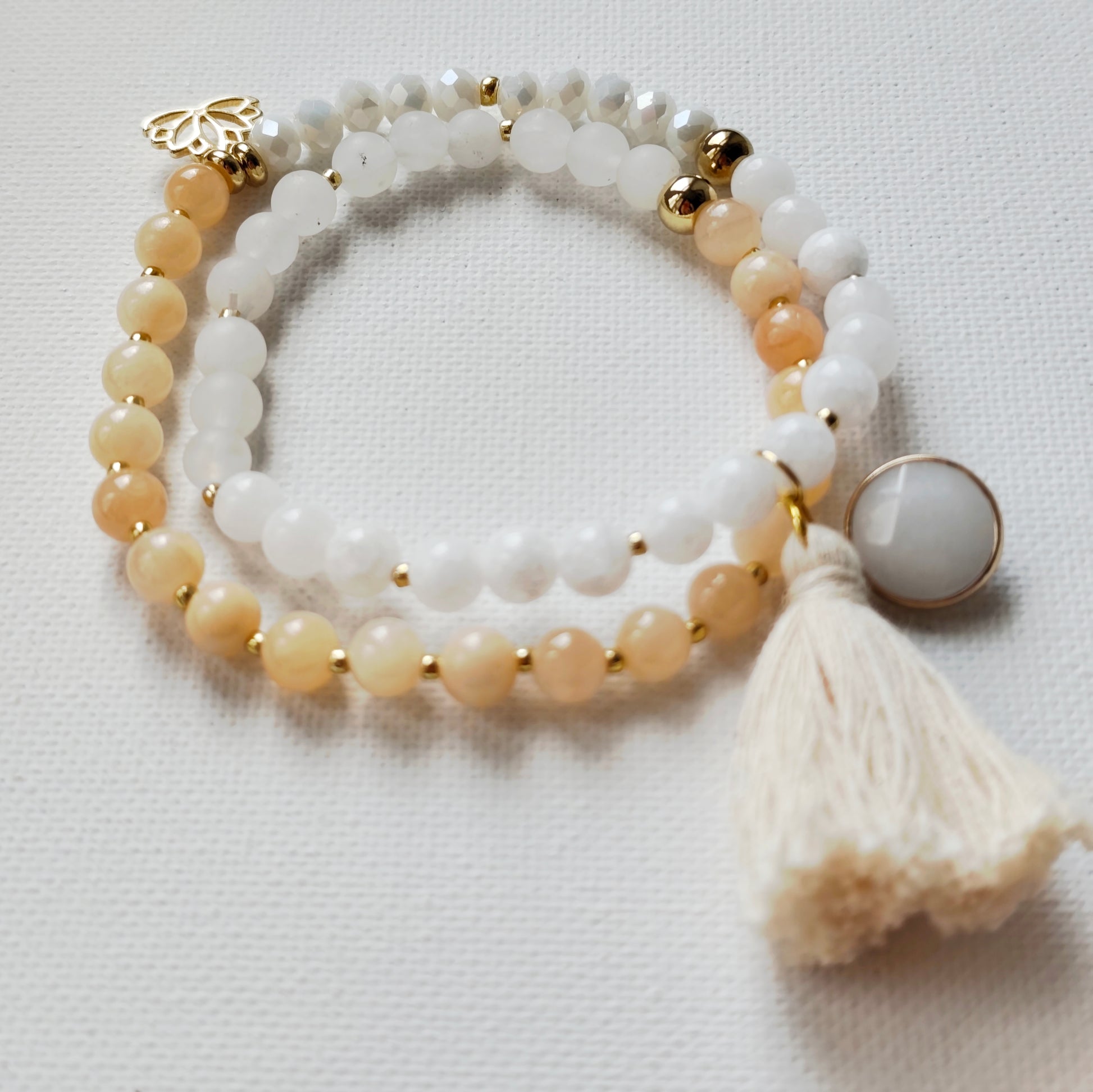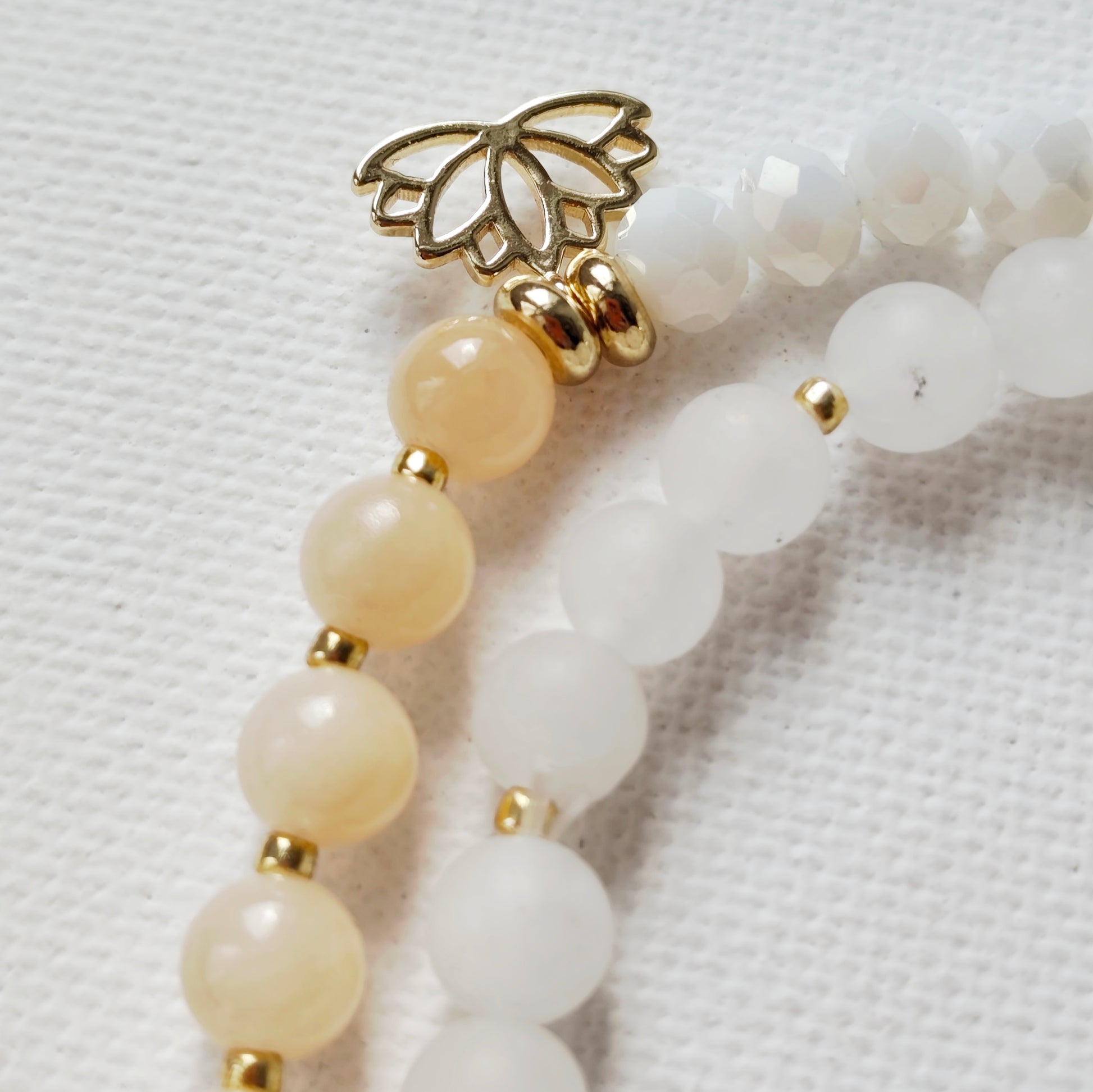 Twin Mala aus weissen Jadeperlen, facettiere Glasperlen, Natursteinperlen, Lotuscharm, Edelsteinanhänger und Quaste